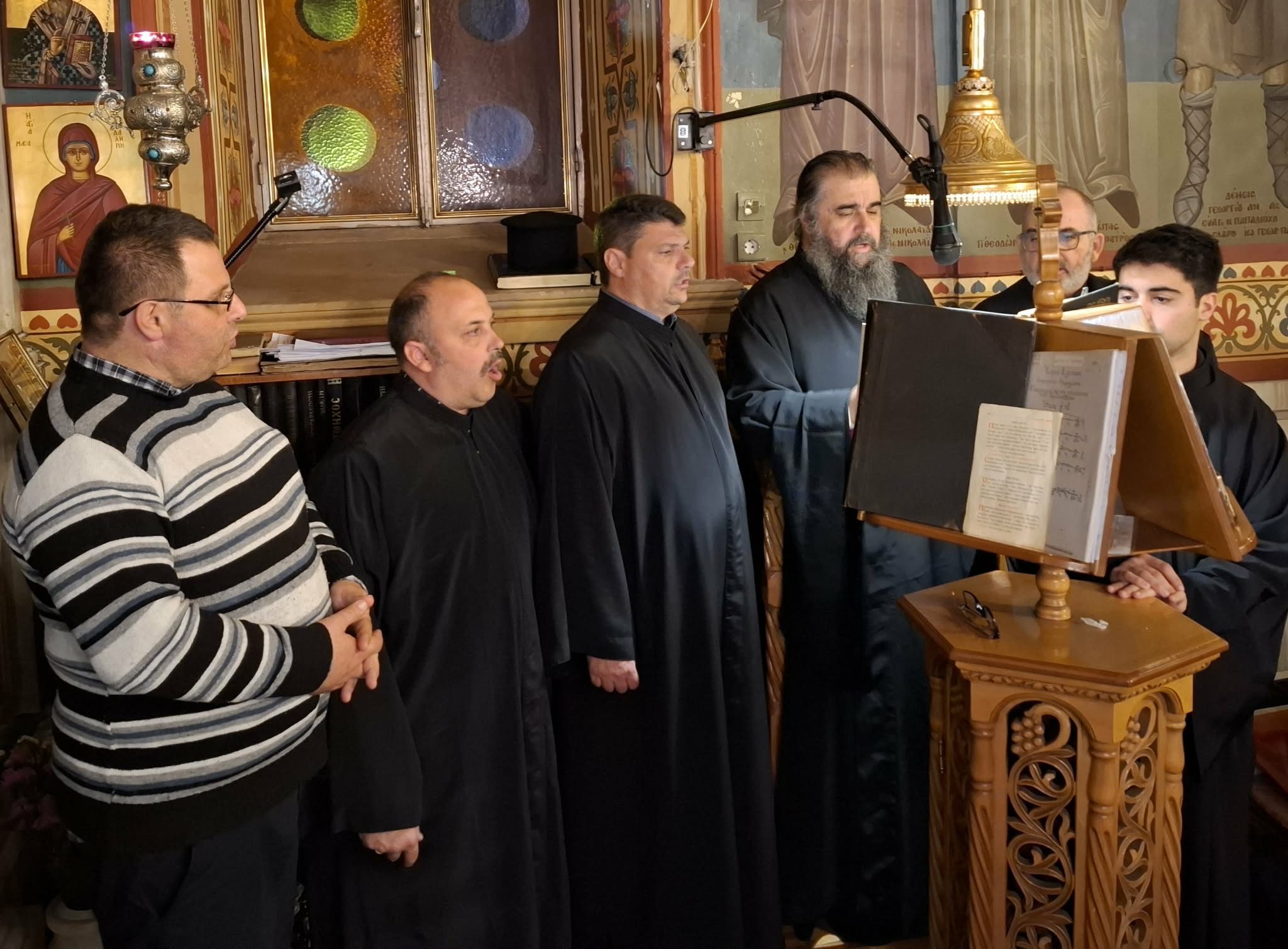 Τους ύμνους απέδωσαν στην ακολουθία του εσπερινού ο Διευθυντής της Σχολής Βυζαντινής Μουσικής Ιωάννης Κουκουζέλης της Ιεράς Μητροπόλεως Καρυστίας και Σκύρου Πρωτοπρ Σωτήριος Τσούγκας εφημέριος Αετού επαρχίας Καρύστου με τον Πρωτοψάλτη του Μητροπολιτικού Ιερού Ναού Αγίου Γεωργίου Αλιβερίου κ. Χαράλαμπο Μαζαράκη και την συμμετοχή και άλλων ιεροψαλτών.