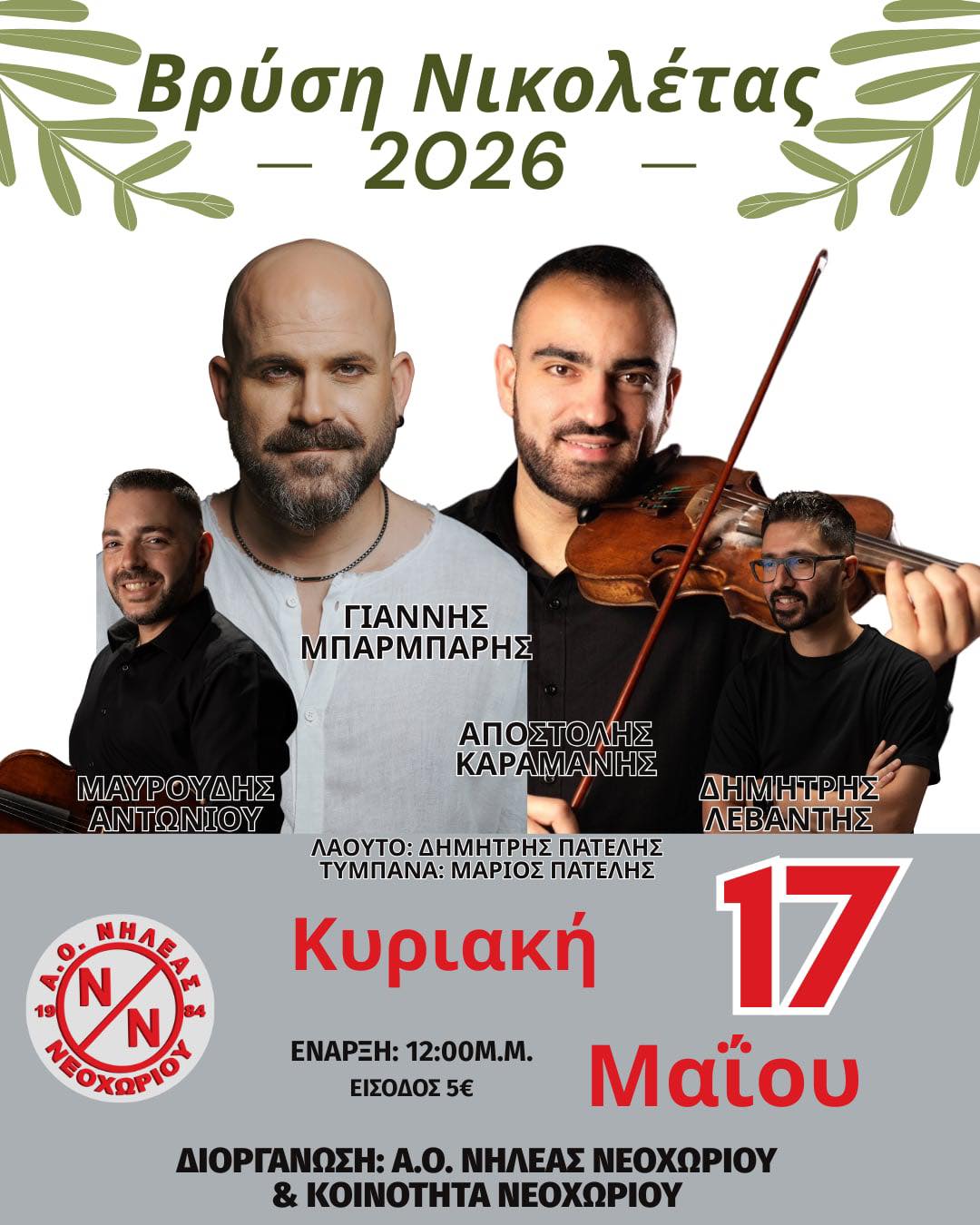 Ο Α.Ο. Νηλέας Νεοχωρίου διοργανώνει την καθιερωμένη ανοιξιάτικη εκδήλωσή του, προσκαλώντας κατοίκους και φίλους της ομάδας σε ένα μεγάλο γλέντι την Κυριακή 17 Μαΐου 2026, στη Βρύση της Νικολέτας.