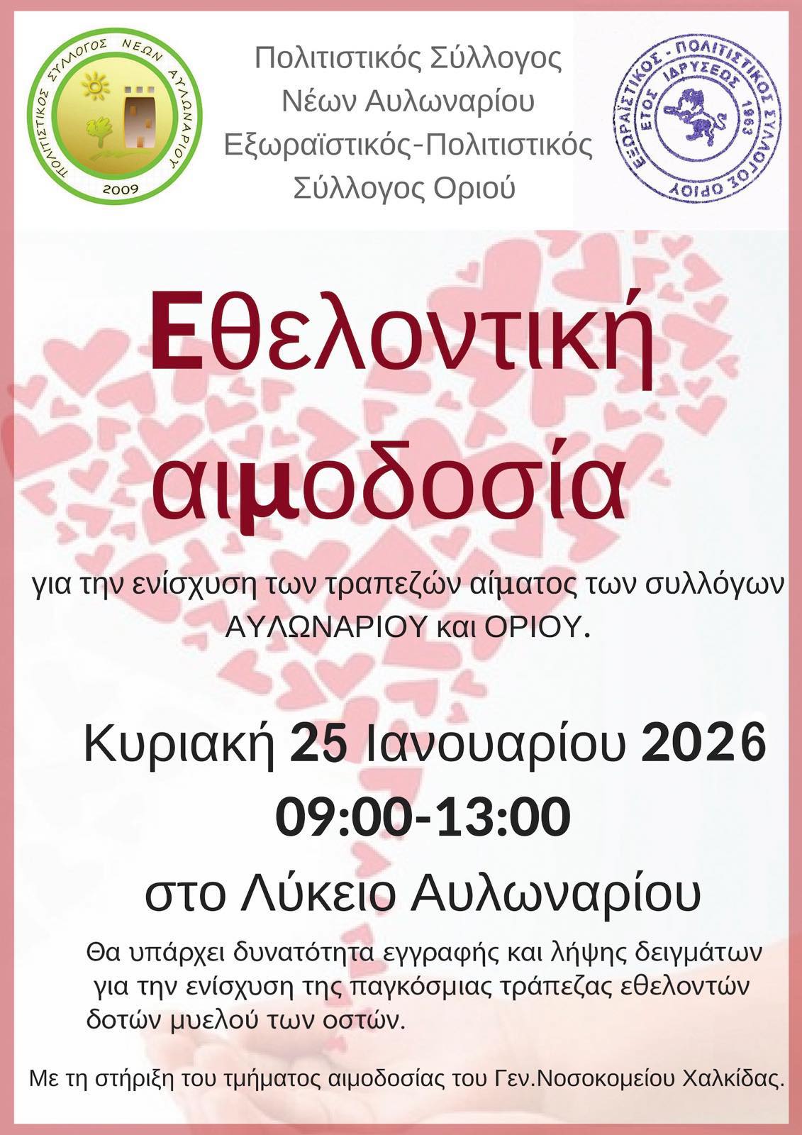 Η αιμοδοσία θα πραγματοποιηθεί την Κυριακή 25 Ιανουαρίου 2026, από τις 09:00 έως τις 13:00, στον χώρο του Λυκείου Αυλωναρίου.