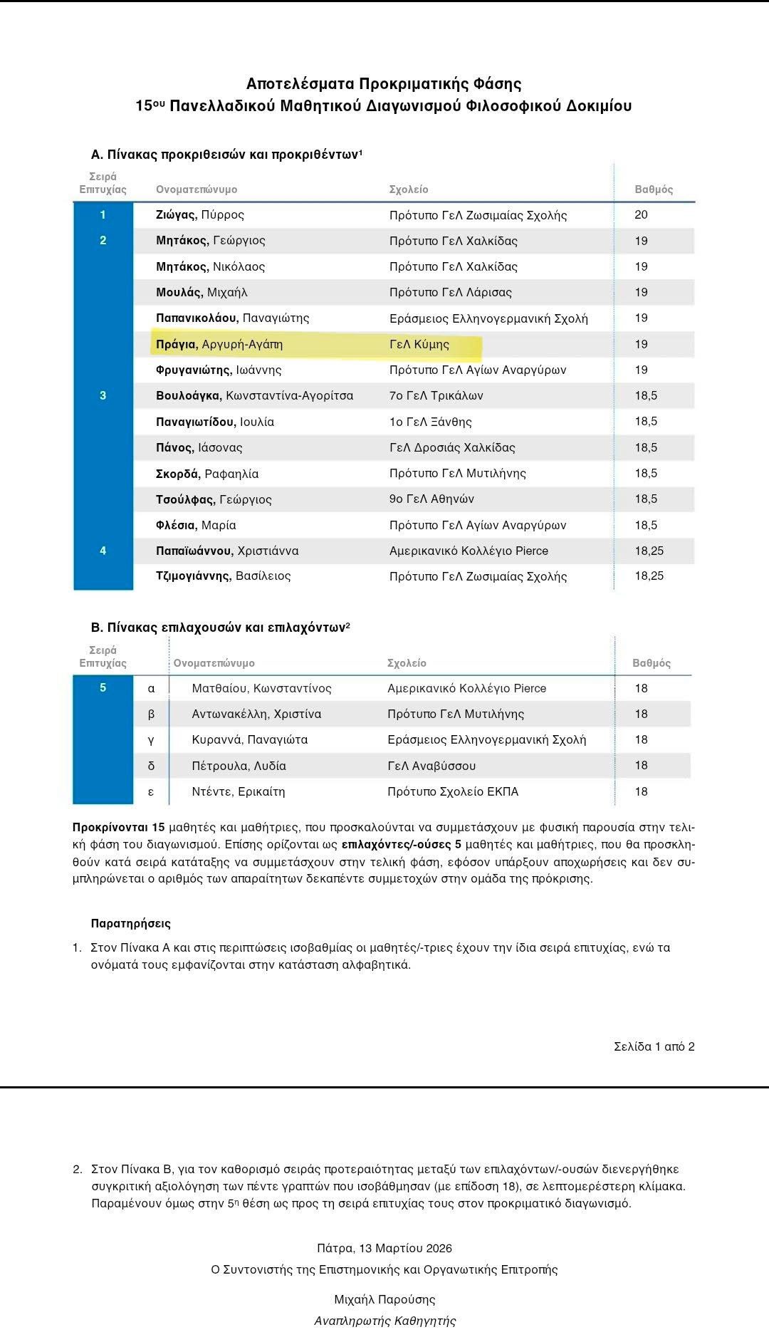 Στην προκριματική φάση διακρίθηκε η μαθήτρια του σχολείου μας Αργυρή-Αγάπη Πράγια, η οποία συγκέντρωσε βαθμό 19 και κατέλαβε τη δεύτερη θέση στην κατάταξη. Της απευθύνουμε θερμά συγχαρητήρια για την εξαιρετική αυτή επιτυχία.