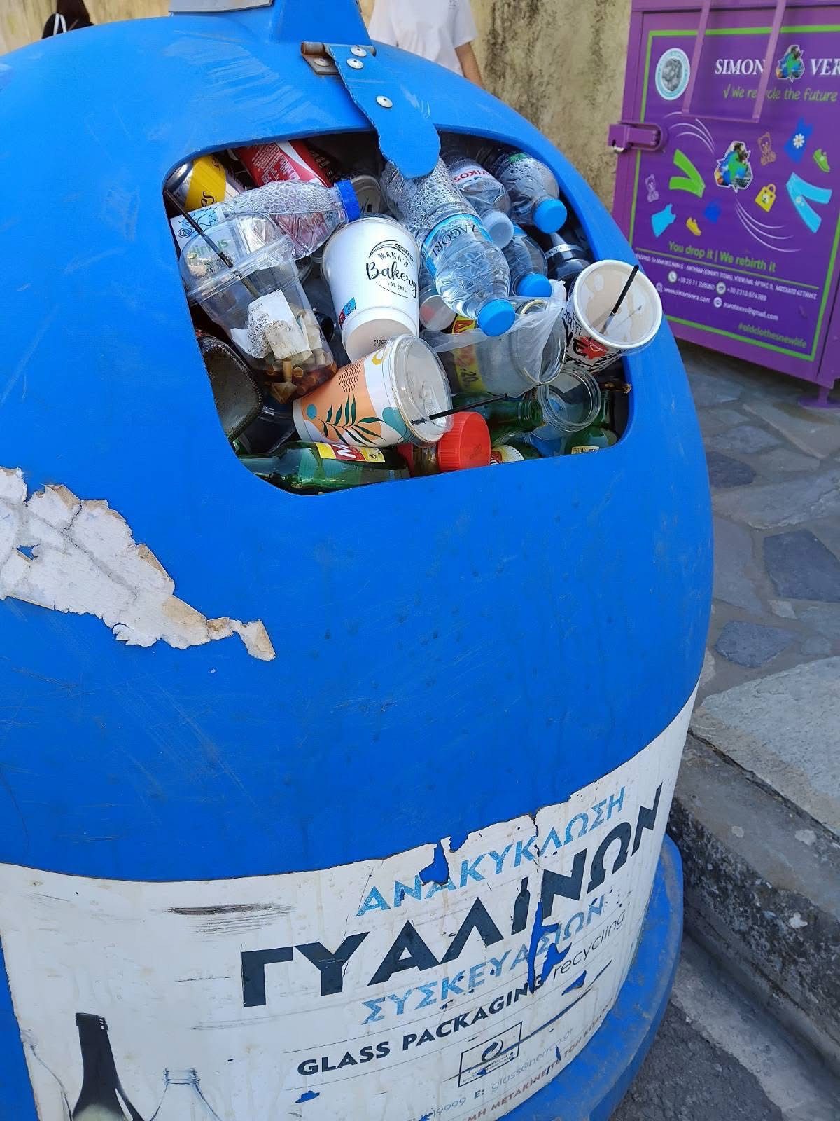 Χαρακτηριστική είναι φωτογραφία που κυκλοφόρησε σε ομάδα του Facebook για την Καρυστία, όπου κάδος ανακύκλωσης γυάλινων συσκευασιών έχει γεμίσει με πλαστικά και χάρτινα ποτήρια και μπουκάλια.