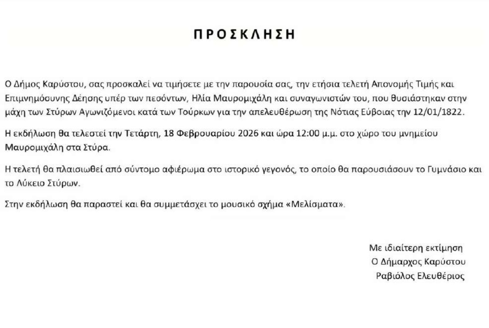 Ο Δήμος Καρύστου σας προσκαλεί στην ετήσια τελετή τιμής και μνήμης του Ηλία Μαυρομιχάλη και των συναγωνιστών του στα Στύρα.