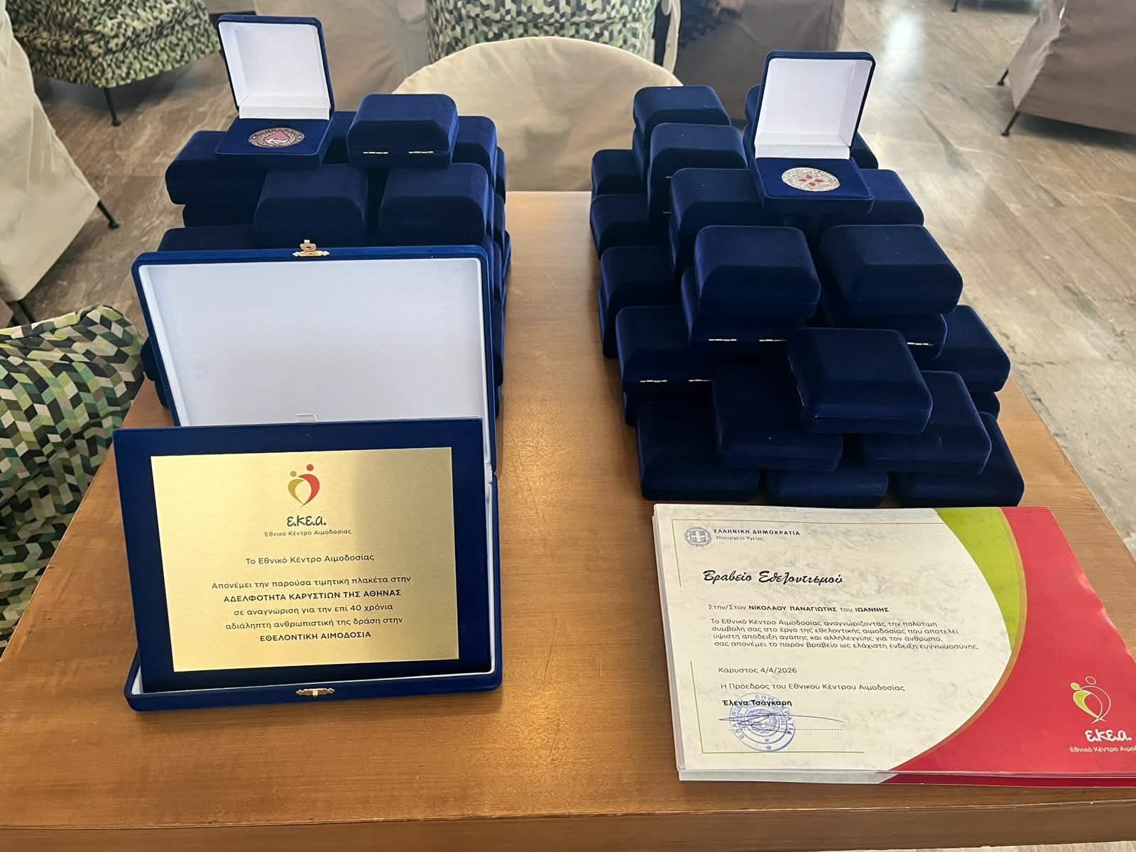 Το Εθνικό Κέντρο Αιμοδοσίας-ΕΚΕΑ είχε την ιδιαίτερη τιμή να βραβεύσει την Αδελφότητα Καρυστίων για αυτά τα 40 χρόνια δράσεων εθελοντικής αιμοδοσίας, αναγνωρίζοντας την αδιάλειπτη και πολύτιμη συμβολή της στην κοινωνία, αλλά και τους τακτικούς εθελοντές αιμοδότες της Καρύστου που χαρίζουν διαχρονικά ζωή, μέσα από μια όμορφη εκδήλωση που πραγματοποιήθηκε χθες (4/4) στο Hotel Karystion.