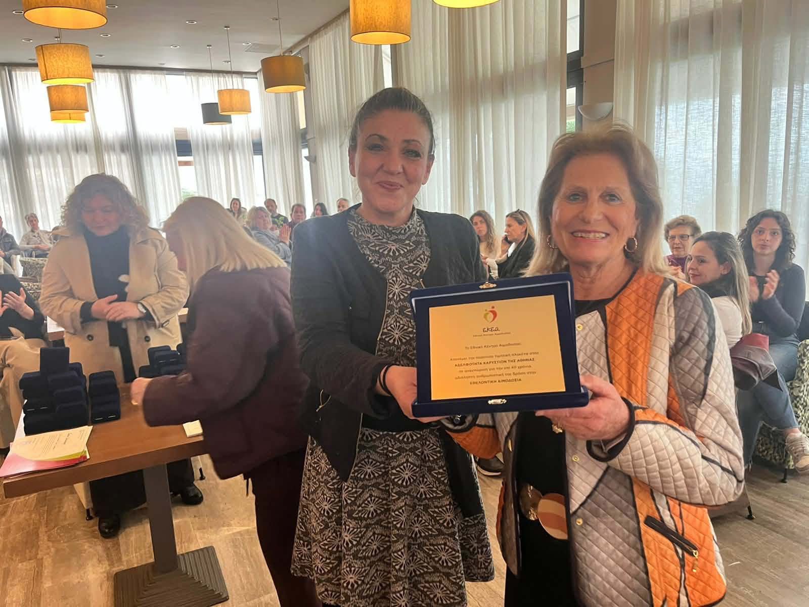 Η εκδήλωση ολοκληρώθηκε με την απονομή τιμητικής πλακέτας από την Πρόεδρο του ΕΚΕΑ κα Τσάγκαρη προς την Πρόεδρο του Διοικητικού Συμβουλίου της Αδελφότητας, κα Ευαγγελία Βαγενά-Παλαιολόγου ως αναγνώριση μιας πορείας γεμάτης αφοσίωση, συνέπεια και ουσιαστικής προσφορά. Την τελετή τίμησαν με την παρουσία τους, ο Δήμαρχος Καρύστου κ. Λευτέρης Ράβιολος, ο Διοικητής του Διόκλειου Νοσοκομείου Καρύστου κ. Δημήτριος Σαραβάνος και στελέχη της Ν.Υ, Αιμοδοσίας του Ιποκράτειου Νοσοκομείου που πραγματοποιούν διήμερη αιμοδοσία στην Κάρυστο (4/5 και 5/5)
