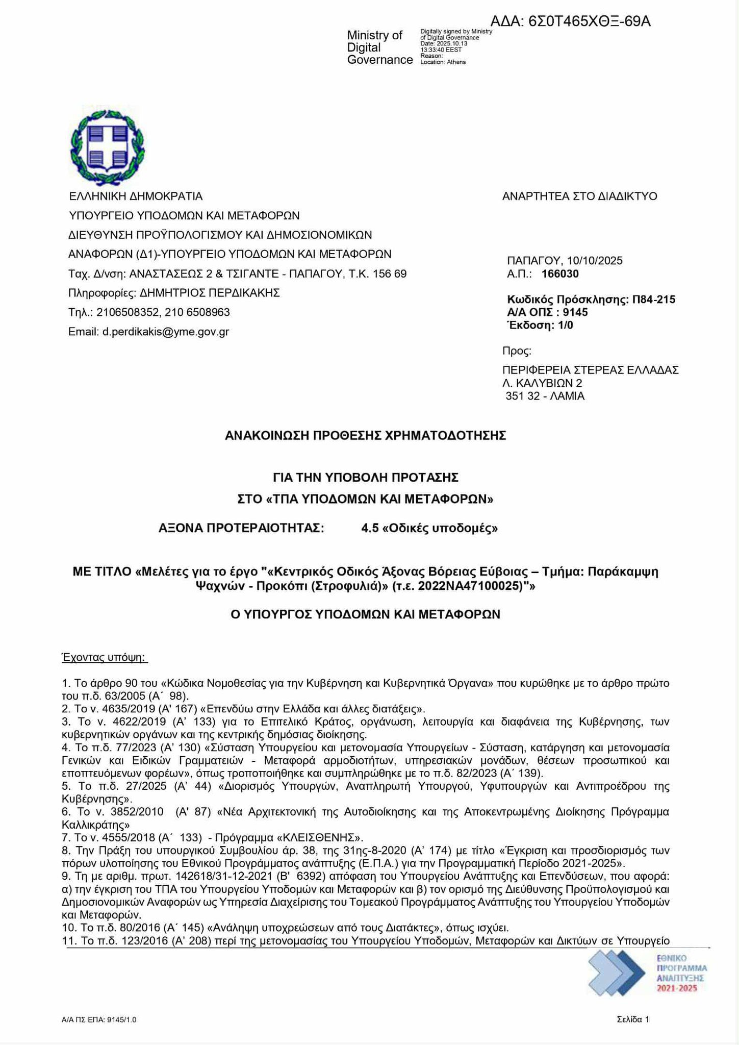 «Χαιρετίζουμε την πρόσκληση του Υπουργείου Υποδομών και Μεταφορών για τη χρηματοδότηση της μελέτης του έργου “Κεντρικός Οδικός Άξονας Βόρειας Εύβοιας – Παράκαμψη Ψαχνών – Προκόπι (Στροφυλιά)”, προϋπολογισμού 7,9 εκατομμυρίων ευρώ, μέσω του Τομεακού Προγράμματος Ανάπτυξης Υποδομών και Μεταφορών 2021–2025.