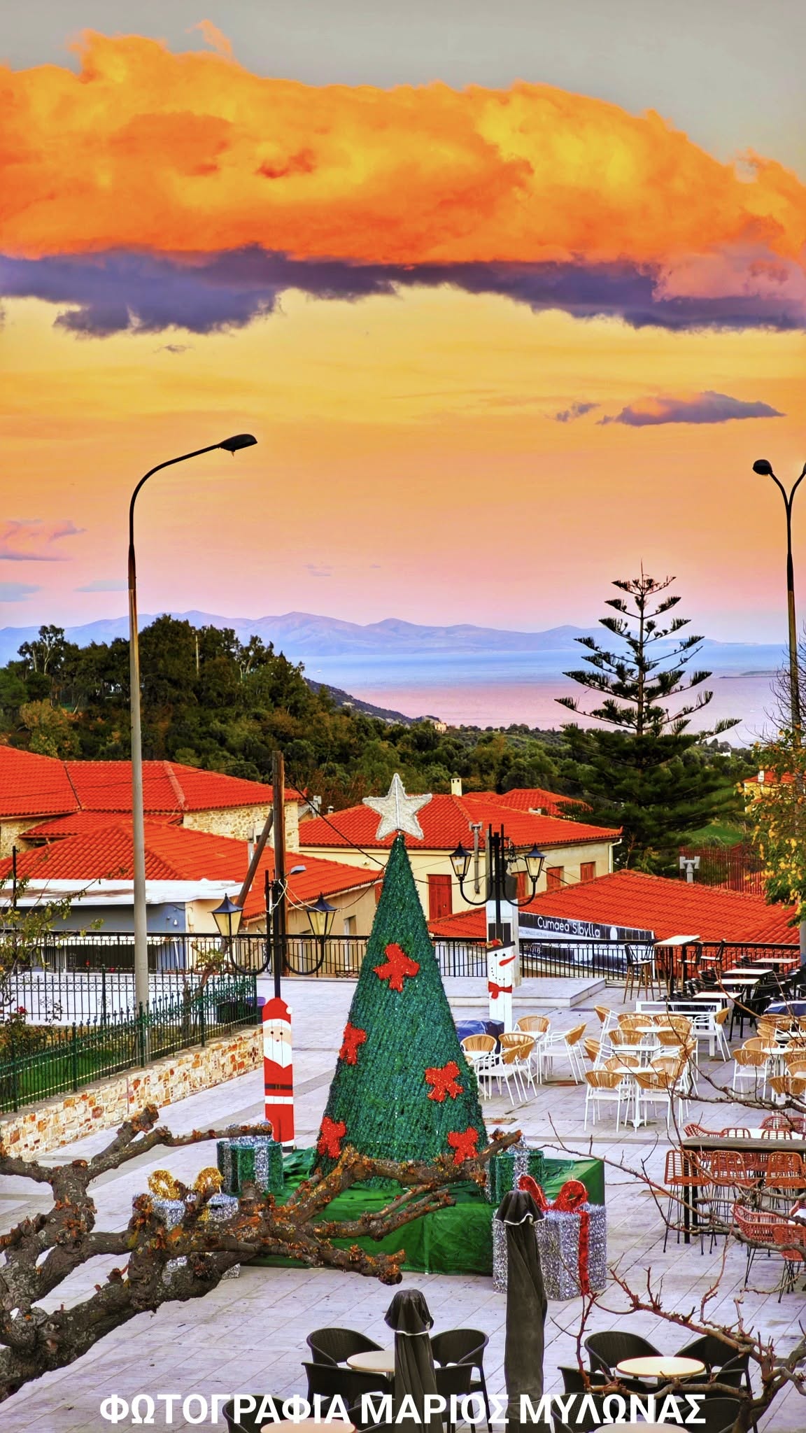 Τα φωτεινά λαμπιόνια και οι χριστουγεννιάτικες διακοσμήσεις δημιουργούν ένα πανέμορφο σκηνικό, ενώ η θέα στη θάλασσα προσθέτει μια μοναδική αίσθηση γαλήνης και ζεστασιάς.