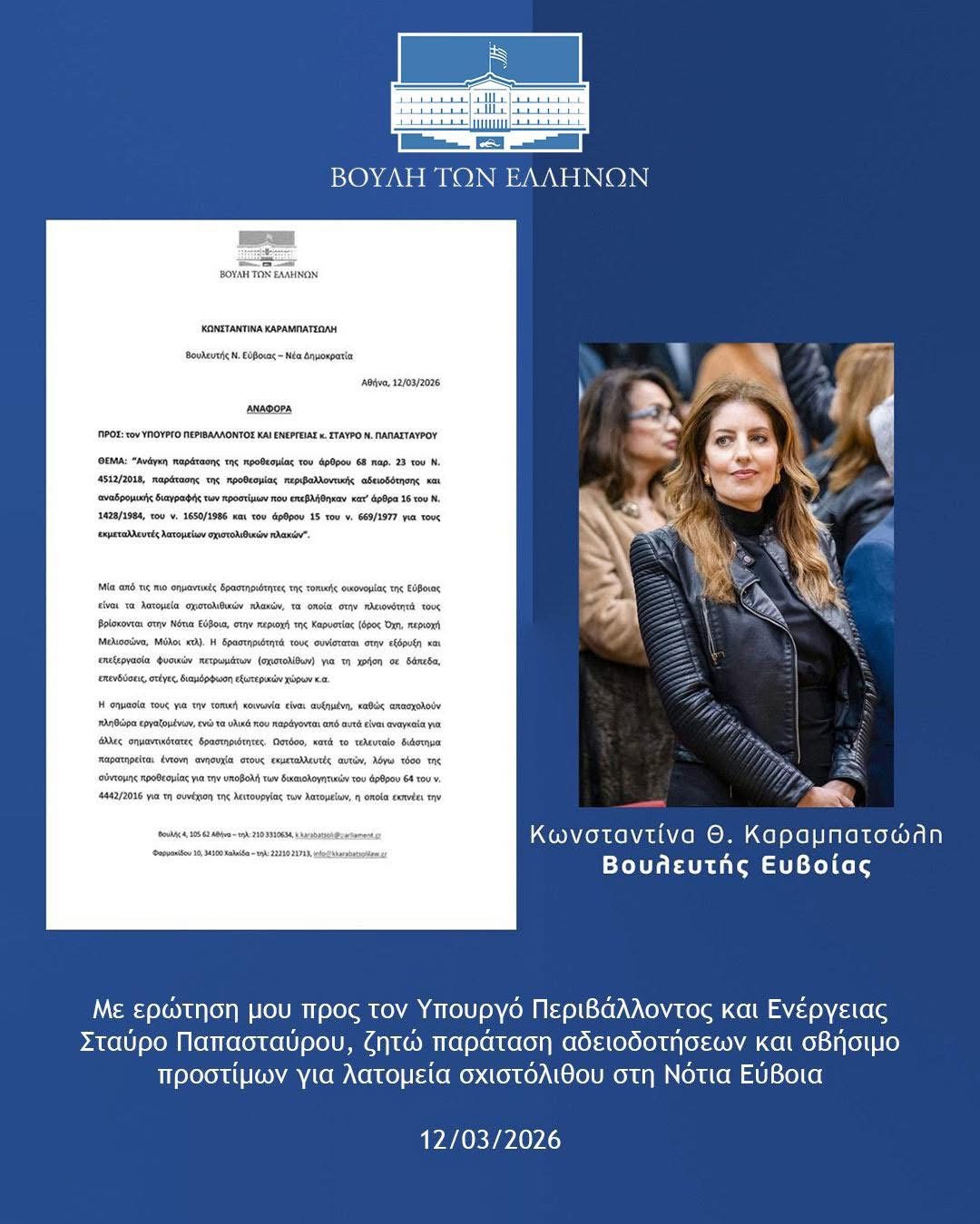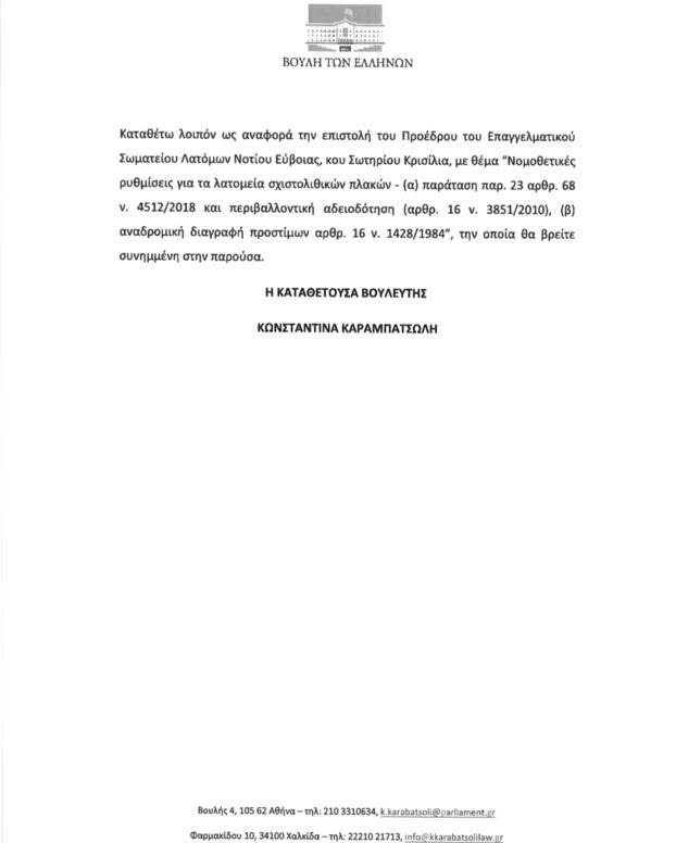 Άμεση λύση για τα λατομεία της Νότια Εύβοια ζητά η Κωνσταντίνα Καραμπατσώλη