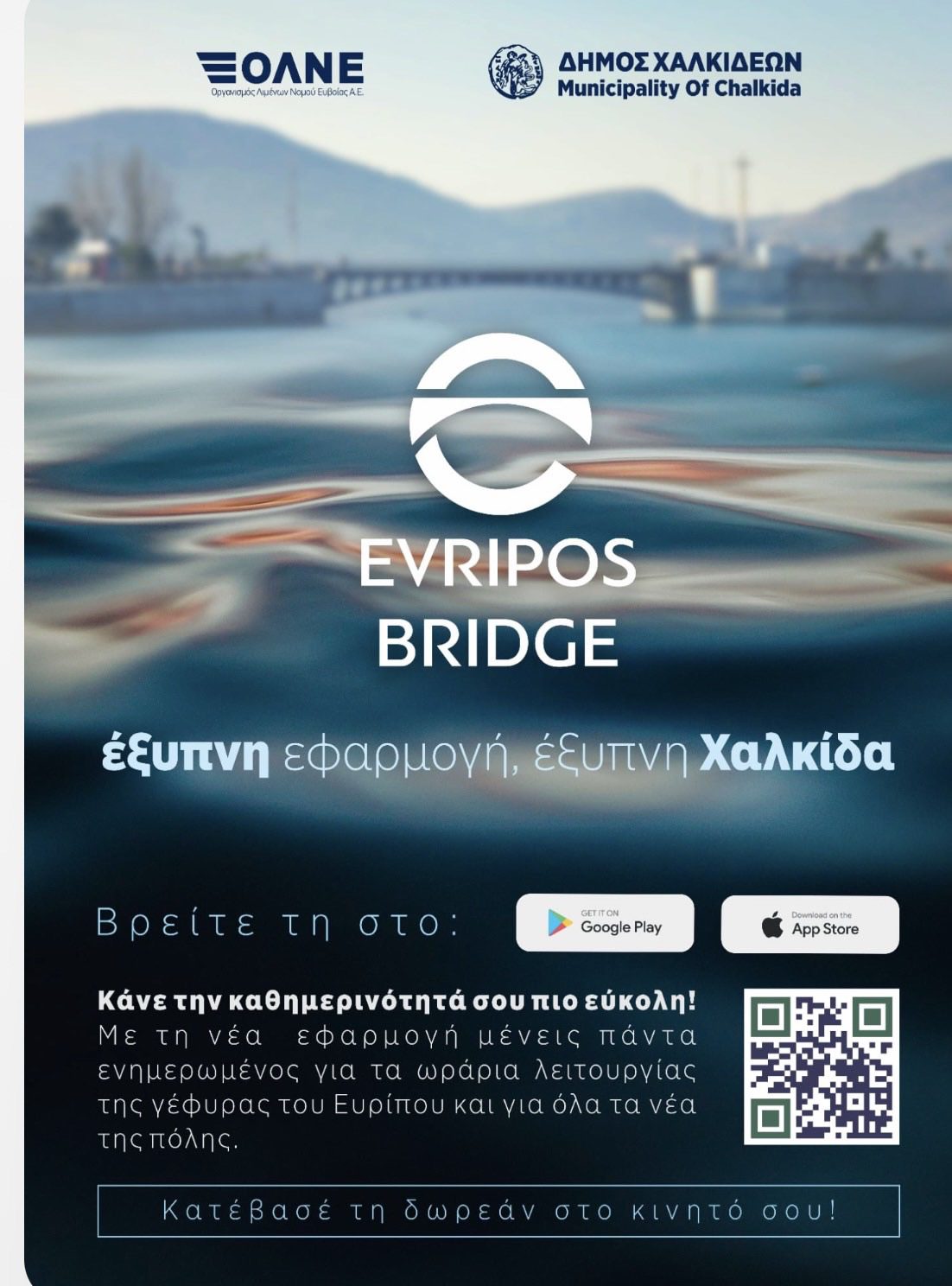 Μια νέα, χρήσιμη εφαρμογή έρχεται να διευκολύνει την καθημερινότητα των πολιτών της Χαλκίδας και των επισκεπτών της πόλης. Το Evripos Bridge είναι η πρώτη ψηφιακή πλατφόρμα που προσφέρει σε πραγματικό χρόνο ενημέρωση για το άνοιγμα της παλιάς κινητής γέφυρας του Ευρίπου, ενός από τα πιο χαρακτηριστικά σημεία της πόλης.