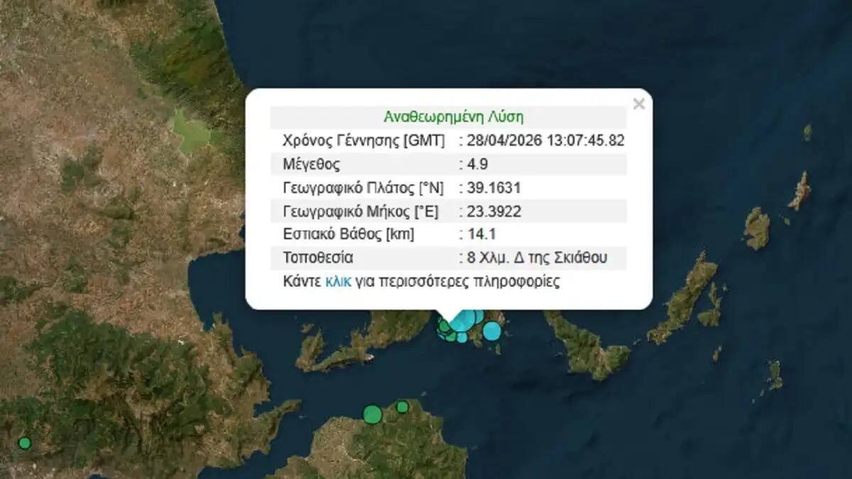 Νέος σεισμός 4,9 Ρίχτερ σημειώθηκε το απόγευμα της Τρίτης (28/04/2026) στη Σκιάθο και έγινε αισθητός στην Εύβοια, ενώ σημειώνονται μετασεισμοί στην περιοχή.