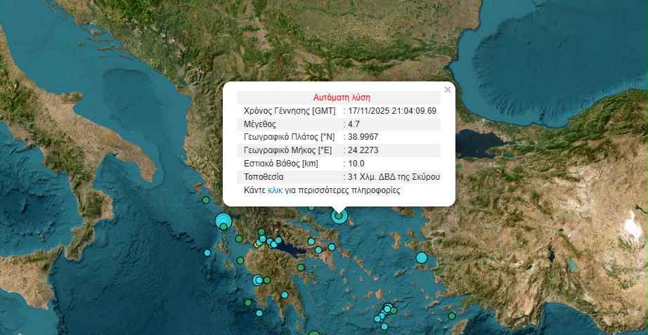 Το επίκεντρο του σεισμού εντοπίζεται 29 χιλιόμετρα ανοιχτά της Σκύρου και 40 χιλιόμετρα από την Κύμη.