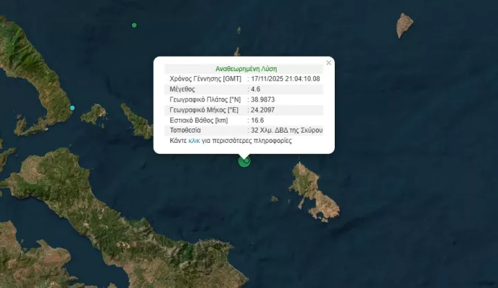 Ο σεισμός έγινε ιδιαίτερα αισθητός σε Εύβοια και ΣκύροΔυνατός σεισμός 4,6 Ρίχτερ έγινε το βράδυ της Δευτέρας, στις 23:04, στη Σκύρο και ταρακούνησε και την Εύβοια.