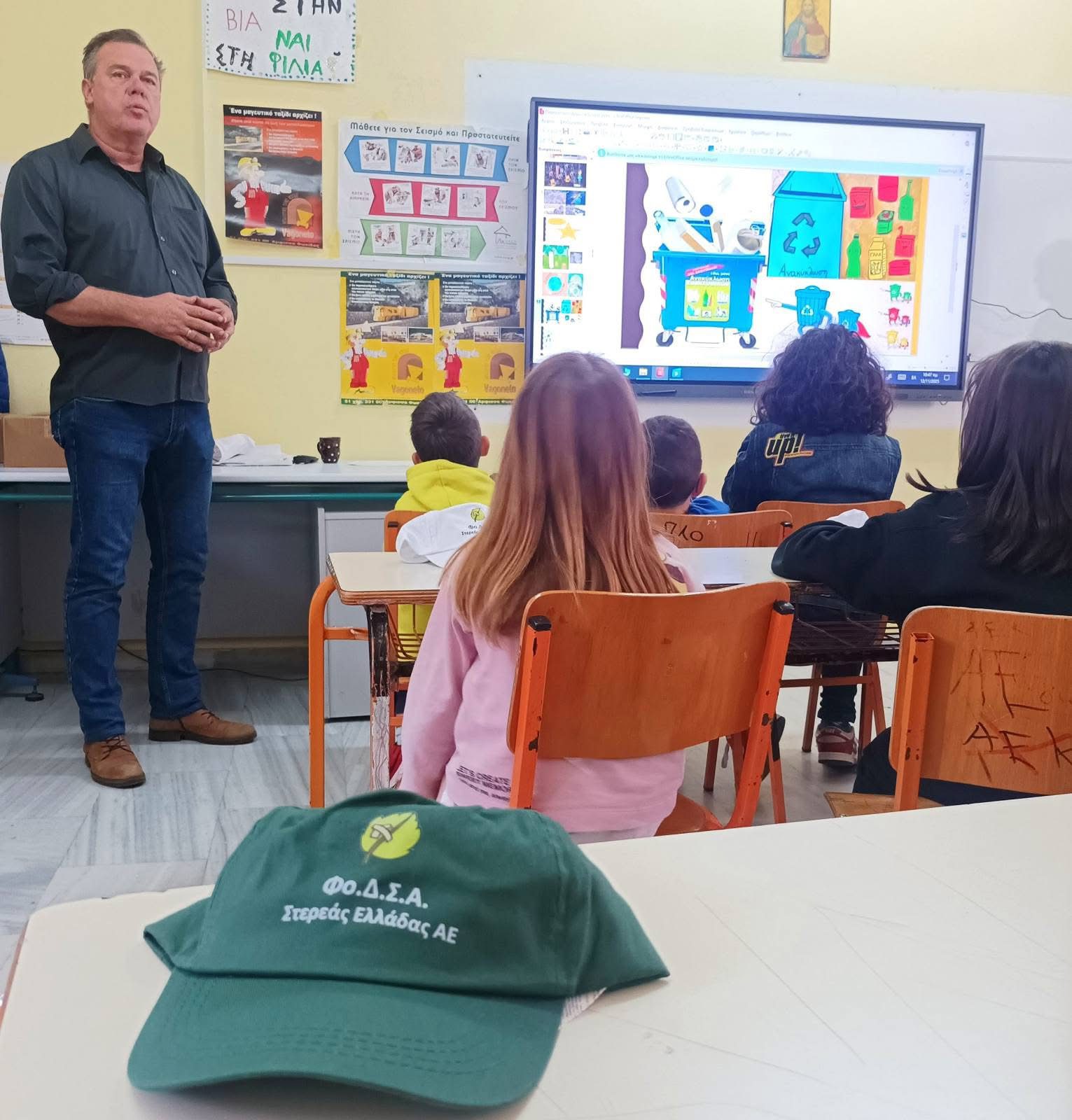 Ο Αντιδήμαρχος Περιβάλλοντος, Καθαριότητας & Πρασίνου του Δήμου Κύμης – Αλιβερίου, κ. Νίκος Μαστροκώστας, συνομίλησε με μαθητές και εκπαιδευτικούς, τονίζοντας τη σπουδαιότητα της ανακύκλωσης τόσο για την τοπική κοινωνία όσο και για τη χώρα συνολικά. Αναφέρθηκε στις συχνές λανθασμένες πρακτικές στην καθημερινή διαχείριση απορριμμάτων και κάλεσε τα παιδιά να γίνουν ενεργοί πρεσβευτές της αλλαγής, μεταφέροντας το μήνυμα της ορθής ανακύκλωσης και μέσα στις οικογένειές τους.