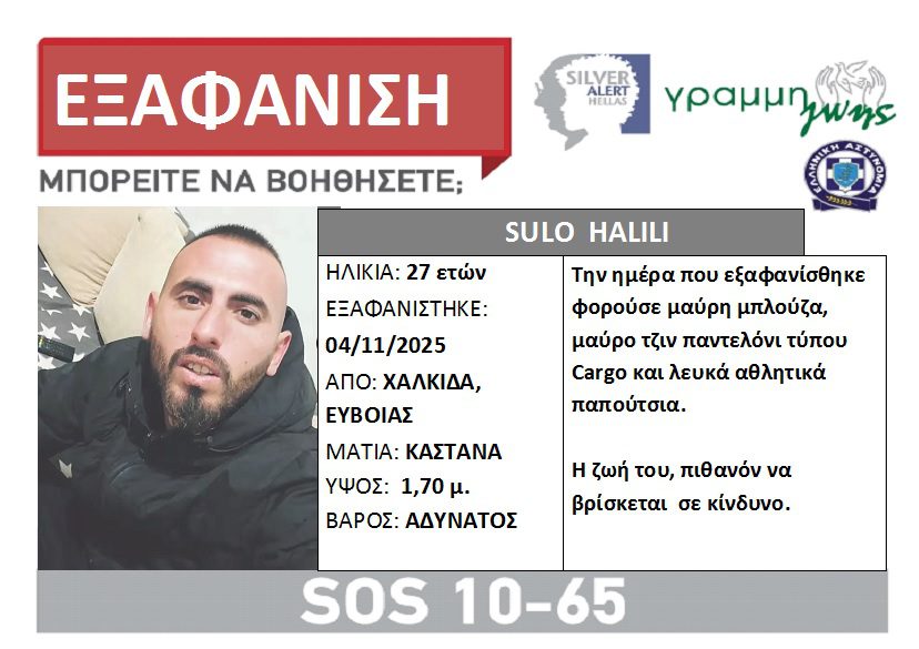 Εξαφάνιση 27χρονου από την Εύβοια – Silver Alert σε εξέλιξηΣυναγερμός έχει σημάνει για την εξαφάνιση ενός 27χρονου άνδρα από τη Χαλκίδα, τα ίχνη του οποίου χάθηκαν το απόγευμα της Τρίτης 4 Νοεμβρίου. Αργά το βράδυ της Κυριακής, ξημερώματα της Δευτέρας εκδόθηκε Silver Alert για τον εντοπισμό του.