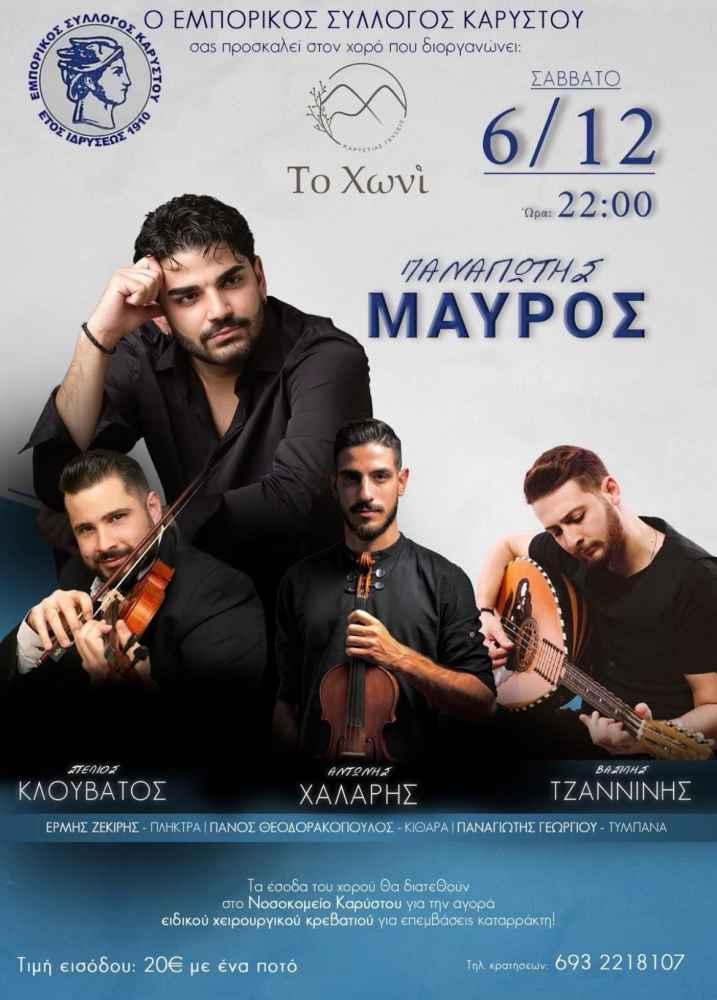 Η είσοδος κοστίζει 20 ευρώ, συμπεριλαμβανομένου ενός ποτού, και όλα τα έσοδα από την εκδήλωση θα διατεθούν στο Νοσοκομείο Καρύστου. Τα χρήματα θα χρησιμοποιηθούν για την αγορά Ειδικού Κρεβατιού για Επεμβάσεις Καταρράκτη, ενισχύοντας τις δυνατότητες του νοσοκομείου και προσφέροντας στους κατοίκους της περιοχής μια σημαντική αναβάθμιση στις υπηρεσίες υγείας.