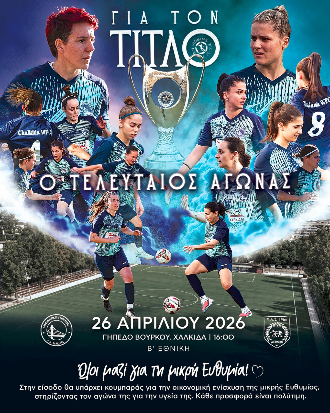 Ο τελευταίος αγώνας τίτλου για την ομάδα του ΠΓΑΟ Χαλκίδας που θα υποδεχθεί την ομάδα του Π.Α.Σ. 1966 Αθηνών θα έχει και φιλανθρωπικό χαρακτήρα.