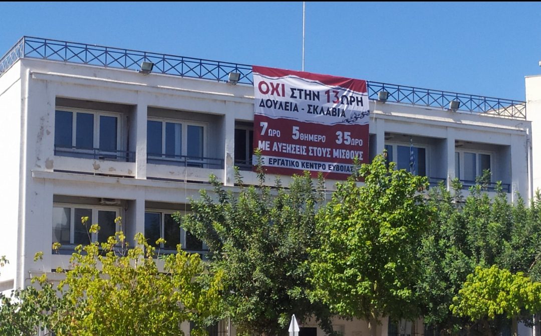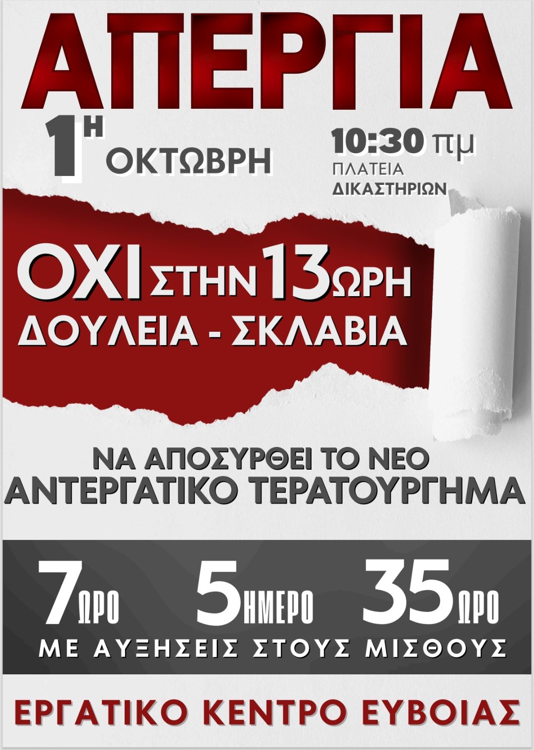 Μαζική απεργία την 1η Οκτώβρη στην Εύβοια, με δυναμική απάντηση στους εργασιακούς εξανδραποδισμούς.Την 1η Οκτώβρη, εργαζόμενοι από όλη την Εύβοια προγραμματίζουν μαζική συμμετοχή στην πανελλαδική απεργία, με στόχο την αντίσταση στο νομοσχέδιο της κυβέρνησης που προωθεί τη 13ωρη εργασία. Στη Χαλκίδα η συγκέντρωση θα πραγματοποιηθεί στις 10:30 π.μ. στην Πλατεία Δικαστηρίων, ενώ σε Αλιβέρι, Μαντούδι και Ιστιαία οι εργαζόμενοι καλούνται να βρεθούν στις πλατείες της περιοχής τους στις 10:00 και 11:00 π.μ.