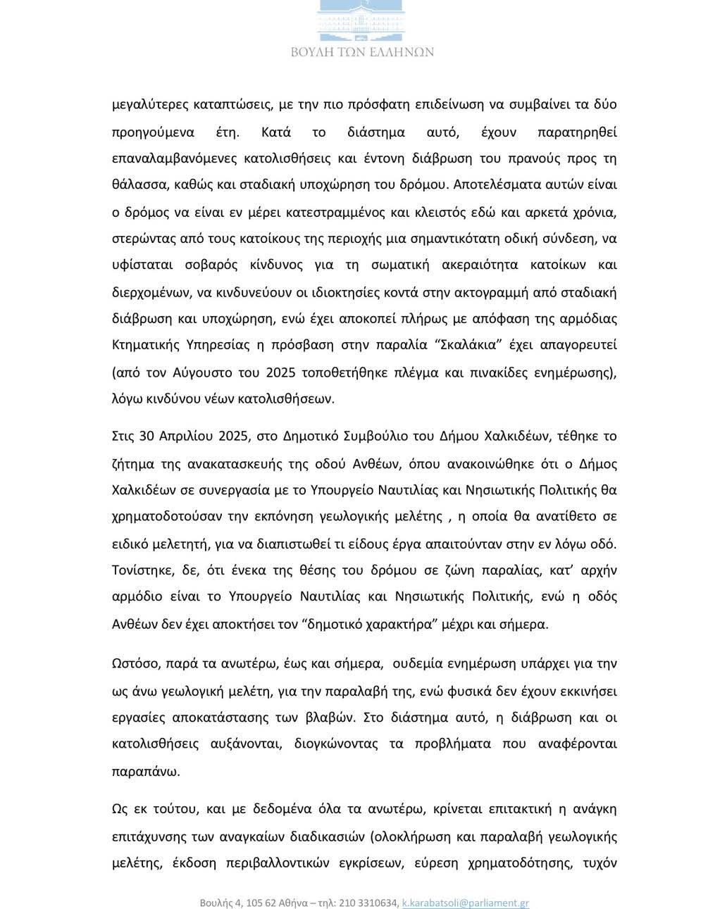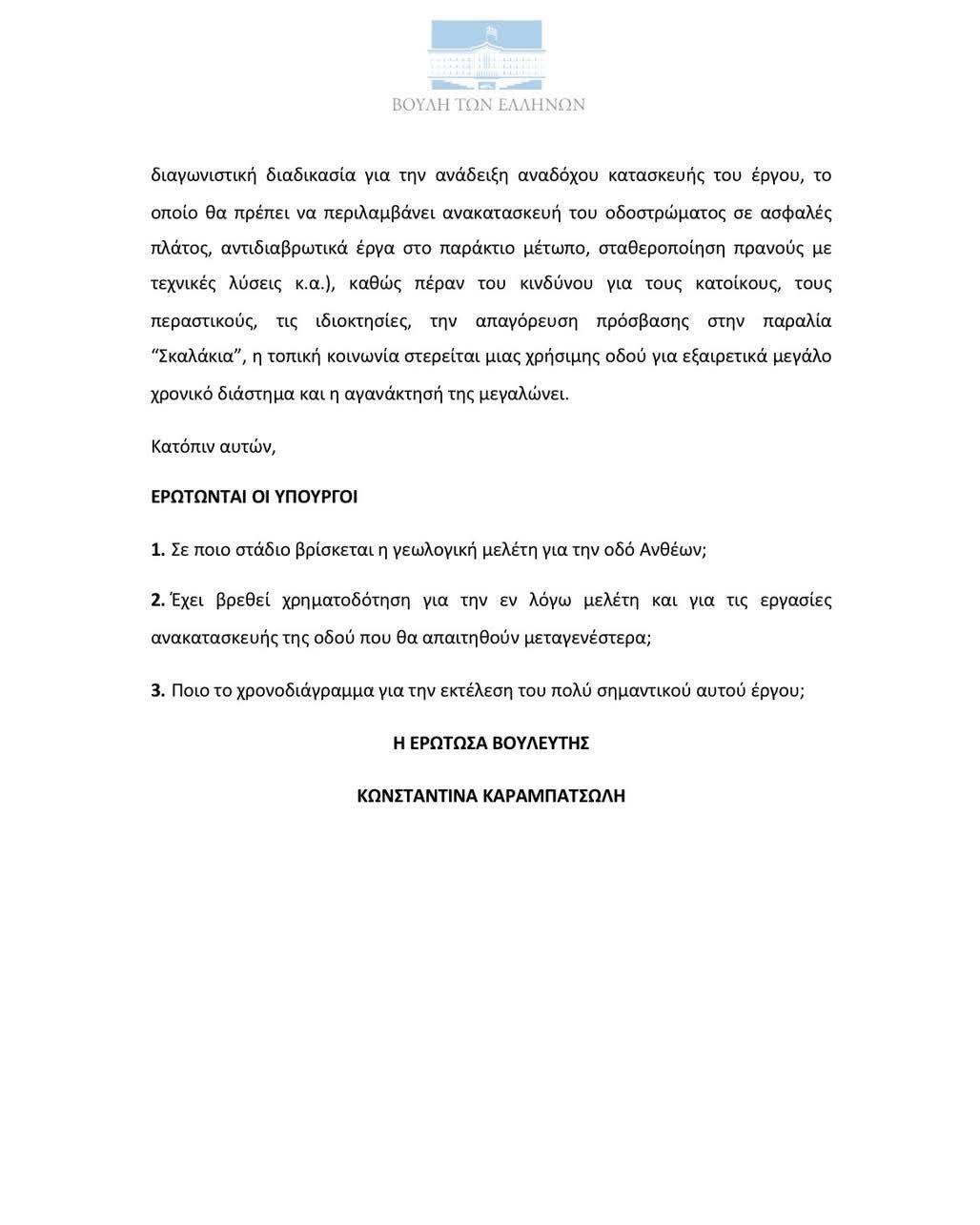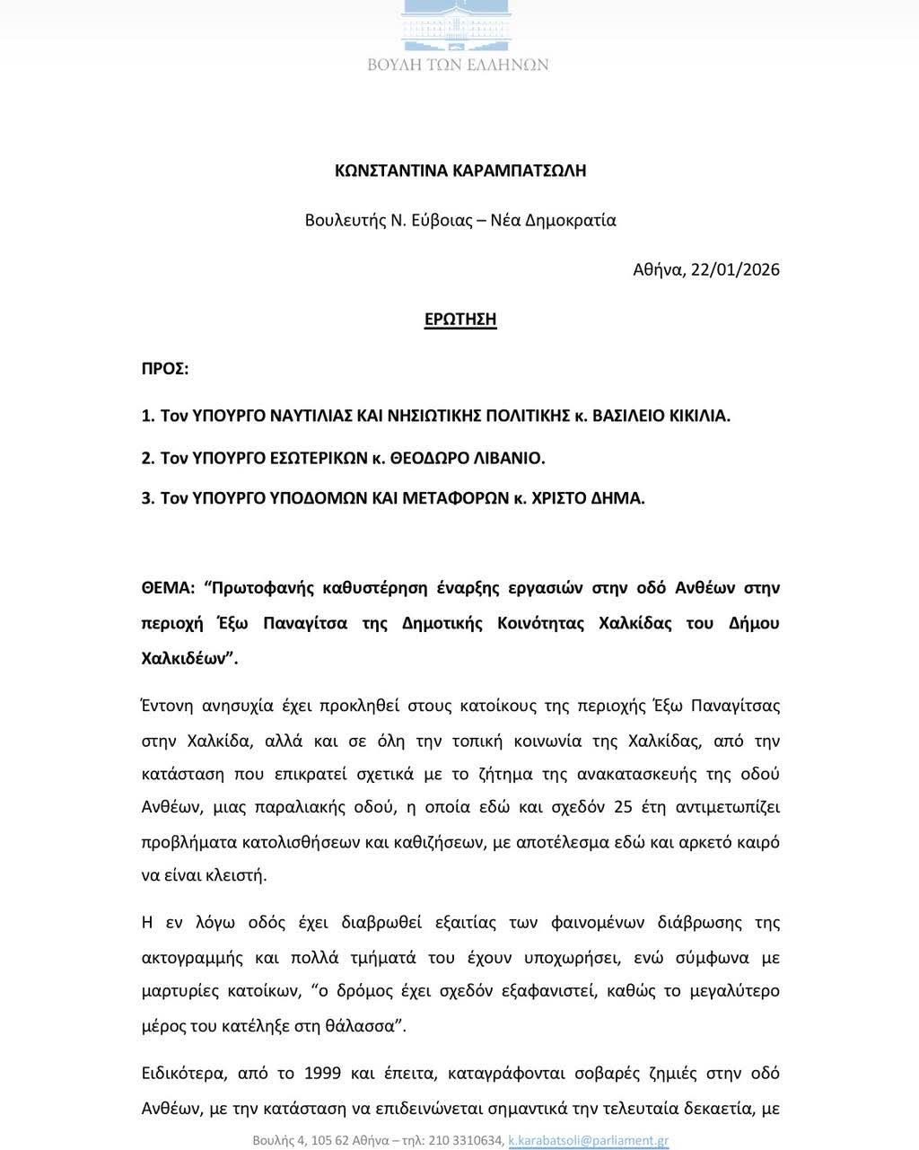 Η βουλευτής Ευβοίας της Νέας Δημοκρατίας, Κωνσταντίνα Καραμπατσώλη, κατέθεσε κοινοβουλευτική ερώτηση (αριθμός πρωτοκόλλου 2515/22.01.2026) προς τα συναρμόδια Υπουργεία Ναυτιλίας, Εσωτερικών και Υποδομών, ζητώντας ξεκάθαρες απαντήσεις σχετικά με την καθυστέρηση στην έναρξη των εργασιών αποκατάστασης της οδού Ανθέων στην Έξω Παναγίτσα Χαλκίδας.