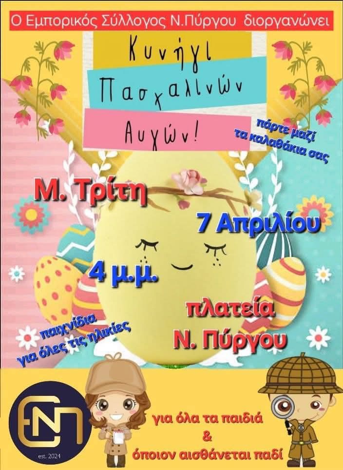 Η πιο χαρούμενη και παιχνιδιάρικη στιγμή της άνοιξης έρχεται στον Νέο Πύργο! Ο Εμπορικός Σύλλογος Νέου Πύργου προσκαλεί μικρούς και μεγάλους σε ένα ξεχωριστό Κυνήγι Πασχαλινών Αυγών, γεμάτο εκπλήξεις, χρώματα και γιορτινή διάθεση.