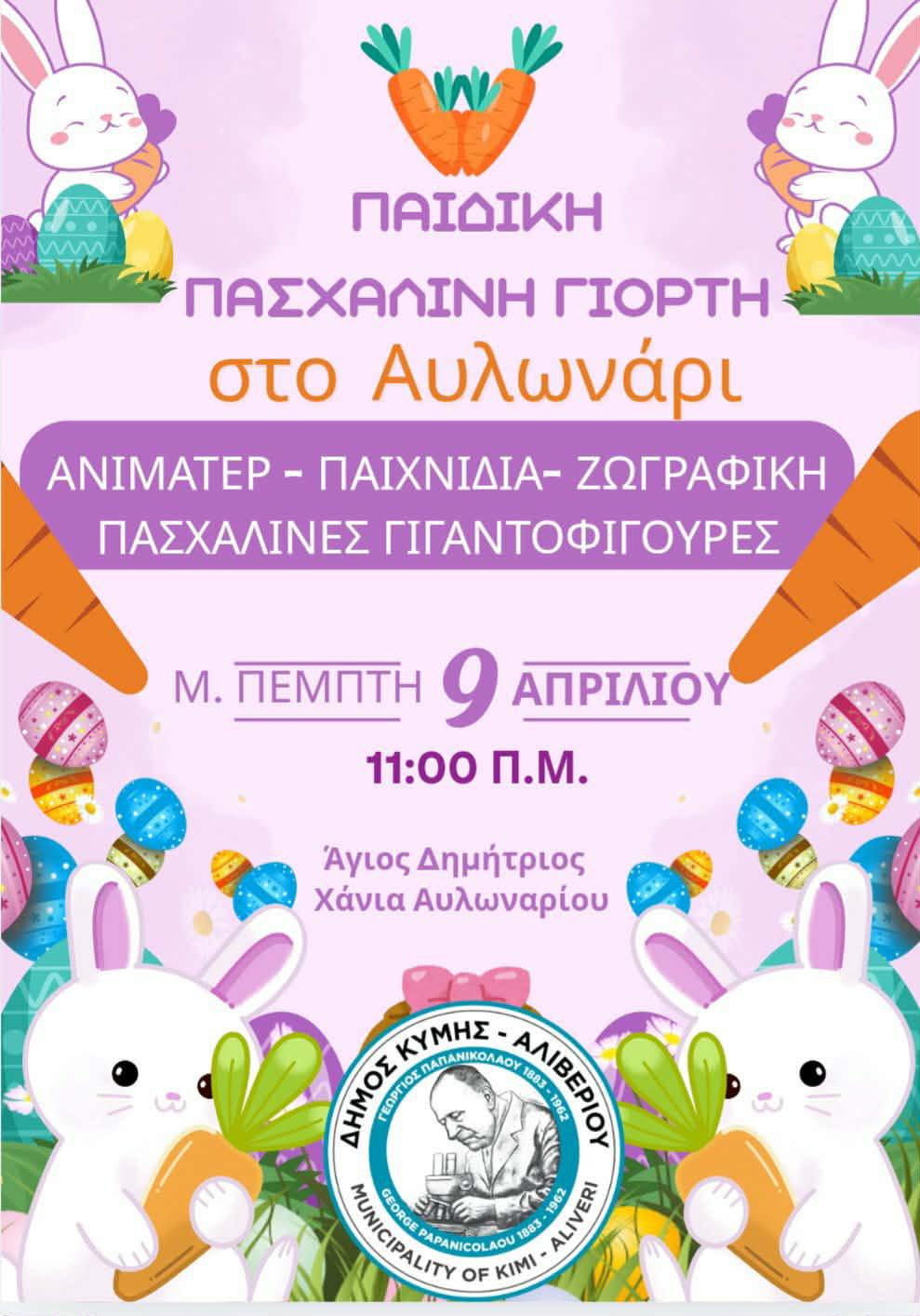 Σήμερα Μεγάλη Πέμπτη 9 Απριλίου και ώρα 11:00 π.μ., στον χώρο του Αγίου Δημητρίου στα Χάνια Αυλωναρίου και στην πλατεία των Κριεζών από τις 16:00 – 18:00, ο Δήμος Κύμης Αλιβερίου σας προσκαλεί σε μια μοναδική γιορτή αφιερωμένη στα παιδιά, αλλά και σε όσους νιώθουν παιδιά!