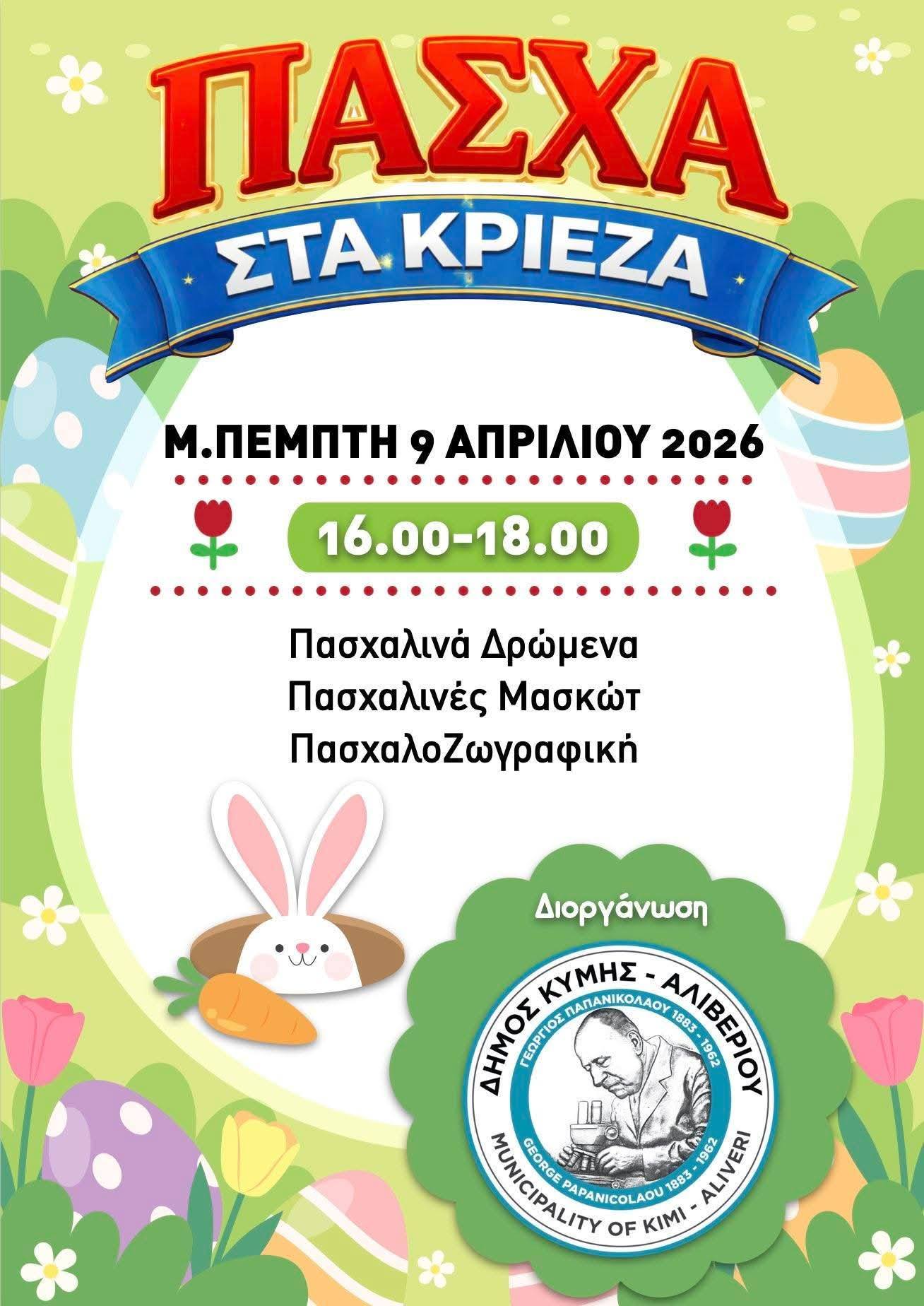 Η Παιδική Πασχαλινή Γιορτή στoν Δήμο Κύμης Αλιβερίου επιστρέφει και υπόσχεται να χαρίσει σε μικρούς και μεγάλους μια αξέχαστη εμπειρία γεμάτη χαρά, παιχνίδι και πασχαλινή μαγεία!