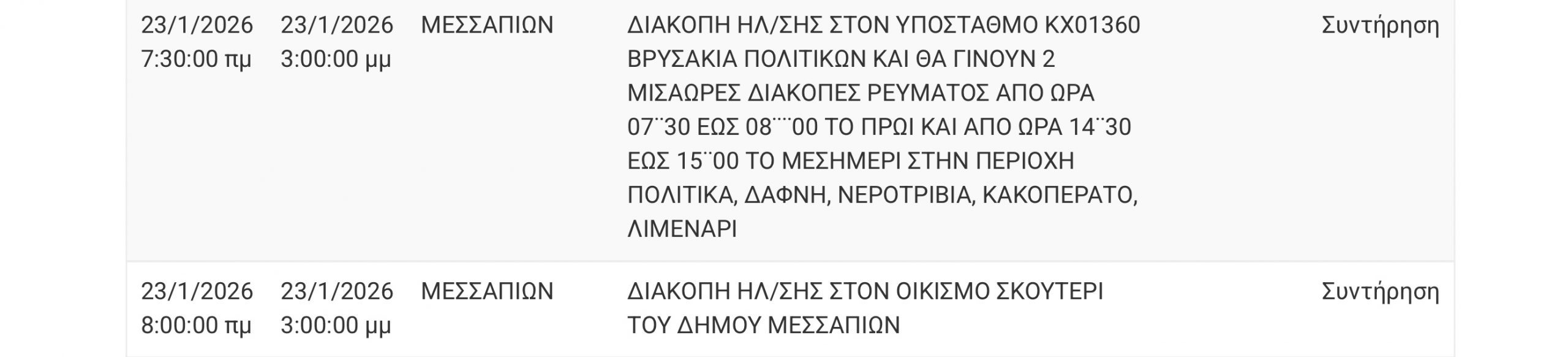 Διακοπή ρεύματος θα πραγματοποιηθεί σήμερα Παρασκευή 23, Ιανουαρίου σε περιοχές του Δήμου Διρφύων Μεσσαπίων στην κεντρική Εύβοια.