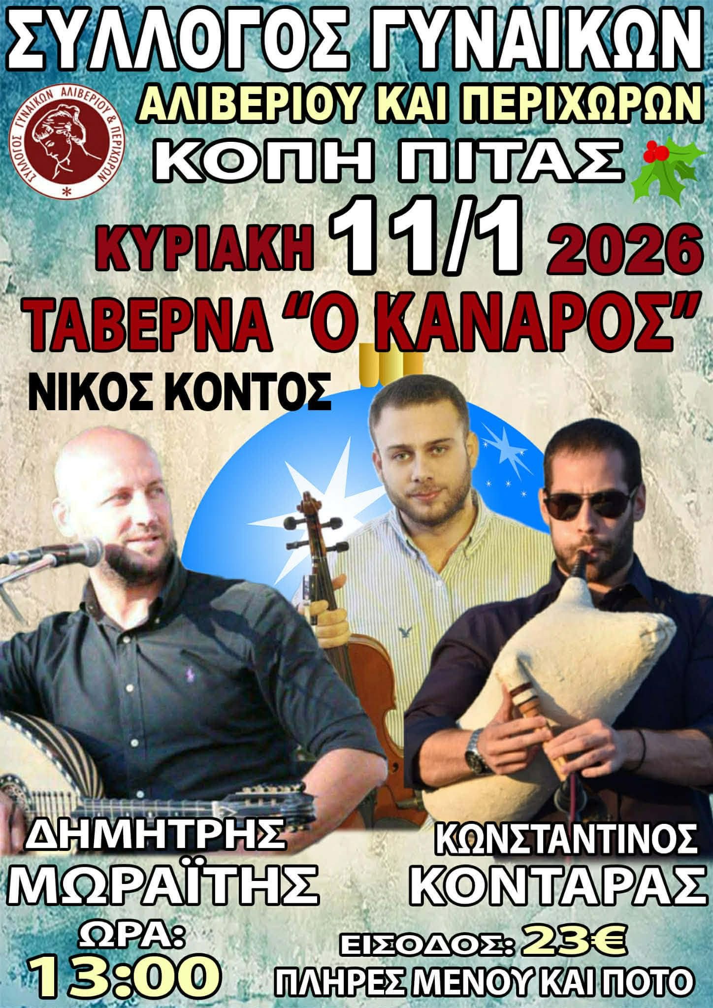Ο Σύλλογος Γυναικών Αλιβερίου & Περιχώρων σας προσκαλεί σήμερα σε μια όμορφη και παραδοσιακή κοπή πίτας, γεμάτη κέφι, μουσική και καλή παρέα!
