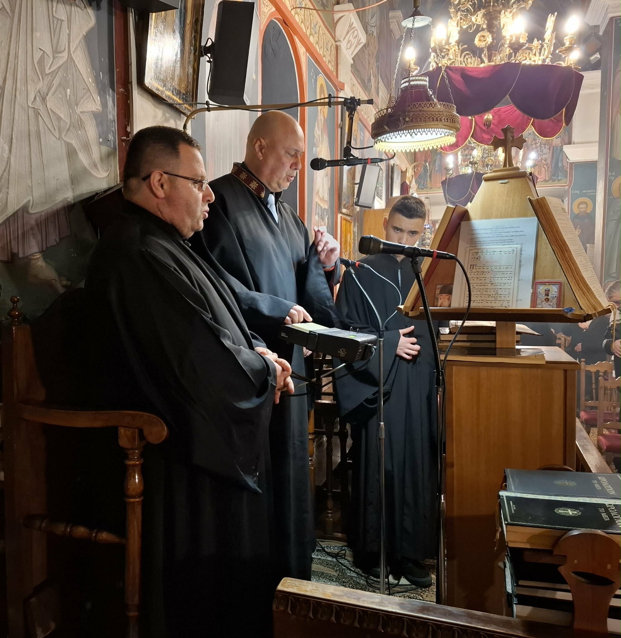 Επίσης τους ύμνους απέδωσαν ο Πρωτοψάλτης του ιερού ναού κ. Ευάγγελος Πολύχρονος ο Ιεροψάλτης του ιερού ναού κ. Δημήτριος Πετρογιάννης με τον Αναγνώστη του ιερού ναού Ανάργυρο Αργύρη.