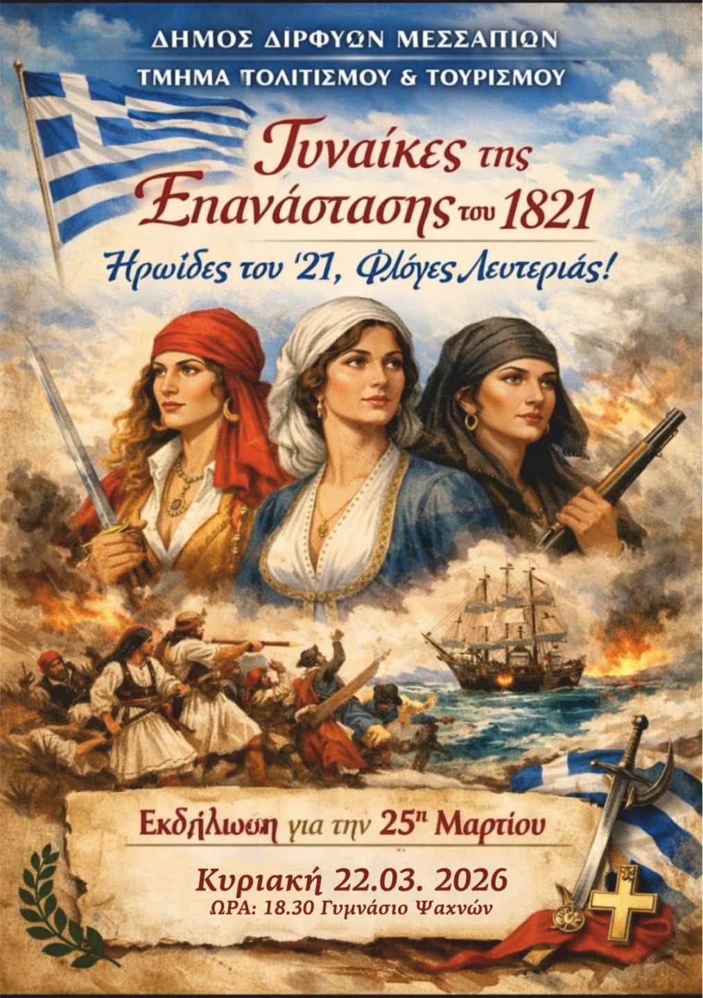 Το Γυμνάσιο Ψαχνών διοργανώνει την Κυριακή 22 Μαρτίου, στις 18:30, στην αίθουσα εκδηλώσεων του σχολείου, ένα ιδιαίτερο αφιέρωμα στις Ελληνίδες που συνέβαλαν στον Αγώνα της Ανεξαρτησίας του 1821.