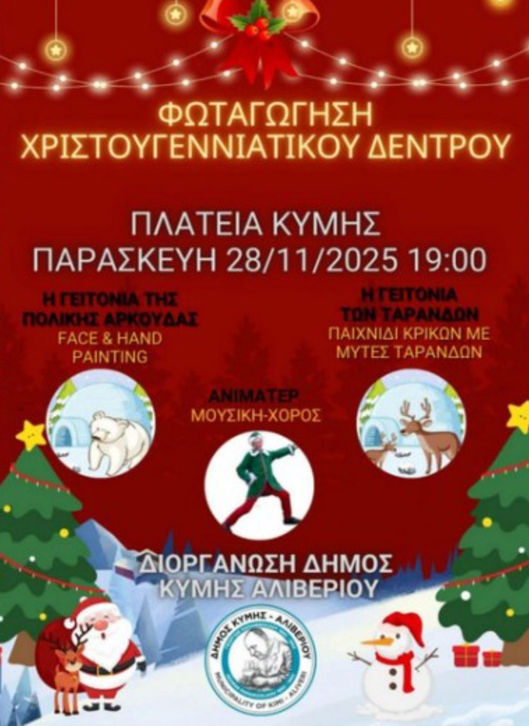 Αναμένονται πολλές δραστηριότητες για όλες τις ηλικίες.Ο Δήμος Κύμης – Αλιβερίου ανοίγει τις πόρτες του στην εορταστική περίοδο, με την φωταγώγηση του Χριστουγεννιάτικου Δέντρου στην κεντρική πλατεία της Κύμης. Η εκδήλωση θα πραγματοποιηθεί την Παρασκευή 28 Νοεμβρίου, στις 7 το απόγευμα, με τη συμμετοχή πλήθους κόσμου, μικρών και μεγάλων.