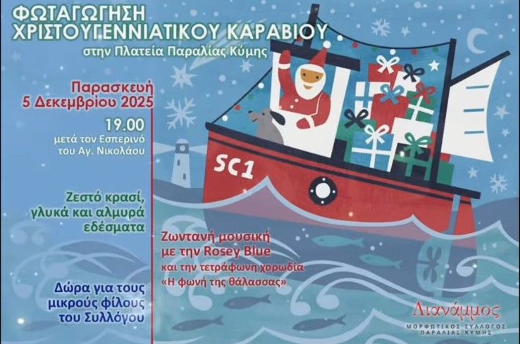 Φως και Χριστουγεννιάτικη Μαγεία στον εορτασμό του Αγίου Νικολάου και Χριστουγεννιάτικο Καράβι!Η Παραλία Κύμης ετοιμάζεται να υποδεχθεί το κοινό με μία μοναδική γιορτή που συνδυάζει τη μαγεία των Χριστουγέννων με την παράδοση και τη ναυτική κληρονομιά της περιοχής. Στην κεντρική Πλατεία της Παραλίας Κύμης, φωτίζεται το εντυπωσιακό χριστουγεννιάτικο καράβι, ενώ οι κάτοικοι και οι επισκέπτες θα έχουν την ευκαιρία να γιορτάσουν τον Άγιο Νικόλαο, τον προστάτη των ναυτικών.
