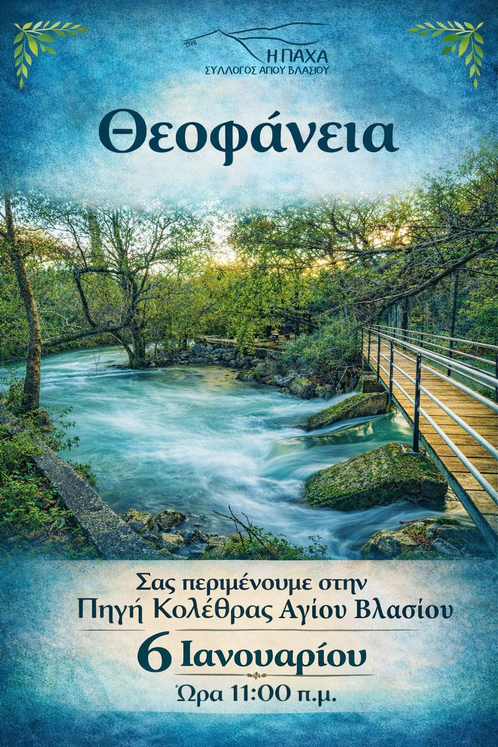 Η τελετή του Αγιασμού των Υδάτων θα πραγματοποιηθεί την Τρίτη, 6 Ιανουαρίου, 11:00 πμ, αμέσως μετά το πέρας της Θείας Λειτουργίας, στην «καρδιά» του φυσικού πλούτου της περιοχής, την πηγή Κολέθρα.’