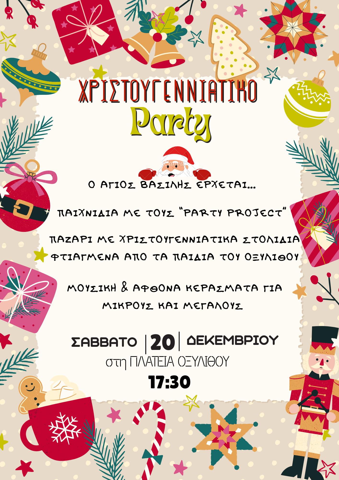 Με μεγάλη χαρά και γιορτινή διάθεση, ο Σύλλογος των Απανταχού Οξυλιθιωτών «Ο Ευαγγελισμός» σε συνεργασία με τον Σύλλογο Γονέων & Κηδεμόνων του Δημοτικού Σχολείου Οξυλίθου σας προσκαλούν σε ένα μοναδικό Χριστουγεννιάτικο Party, αφιερωμένο στα παιδιά, στις οικογένειες και σε όλο το χωριό μας!