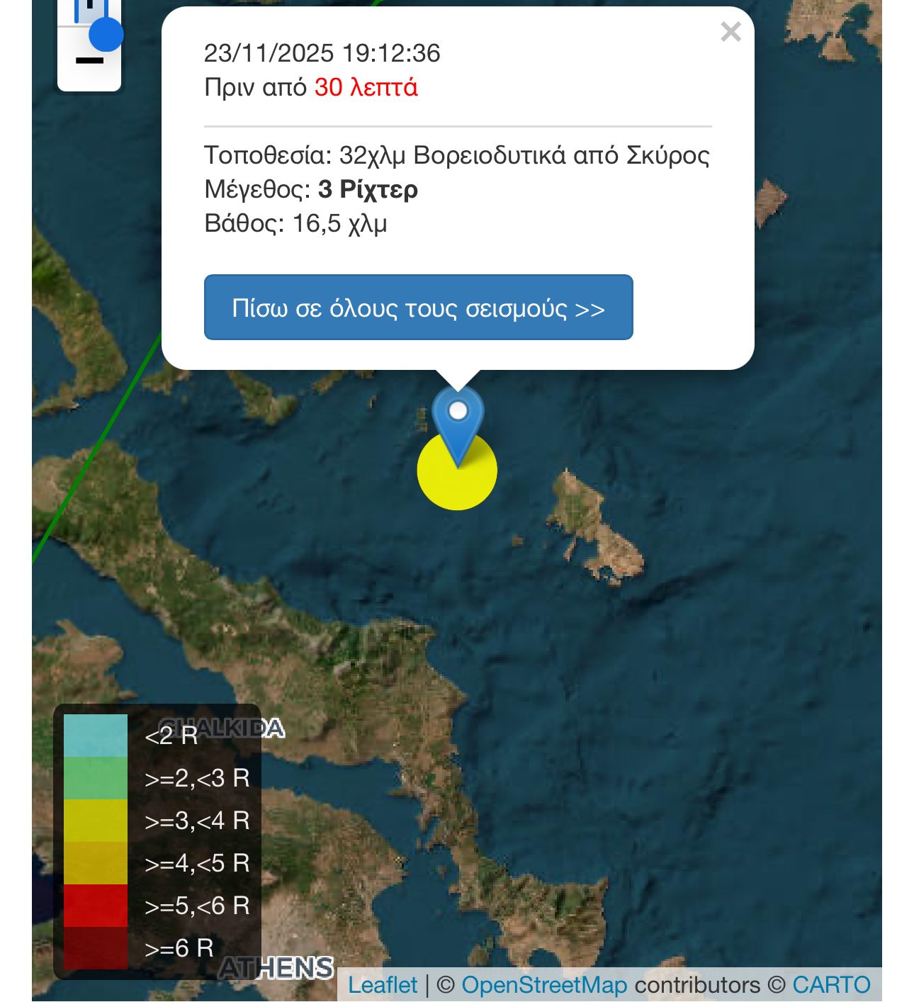 Ο σεισμός σημειώθηκε σήμερα 23/11/2025 19:12:36, είχε επίκεντρο 32χλμ Βορειοδυτικά από τη Σκύρο.