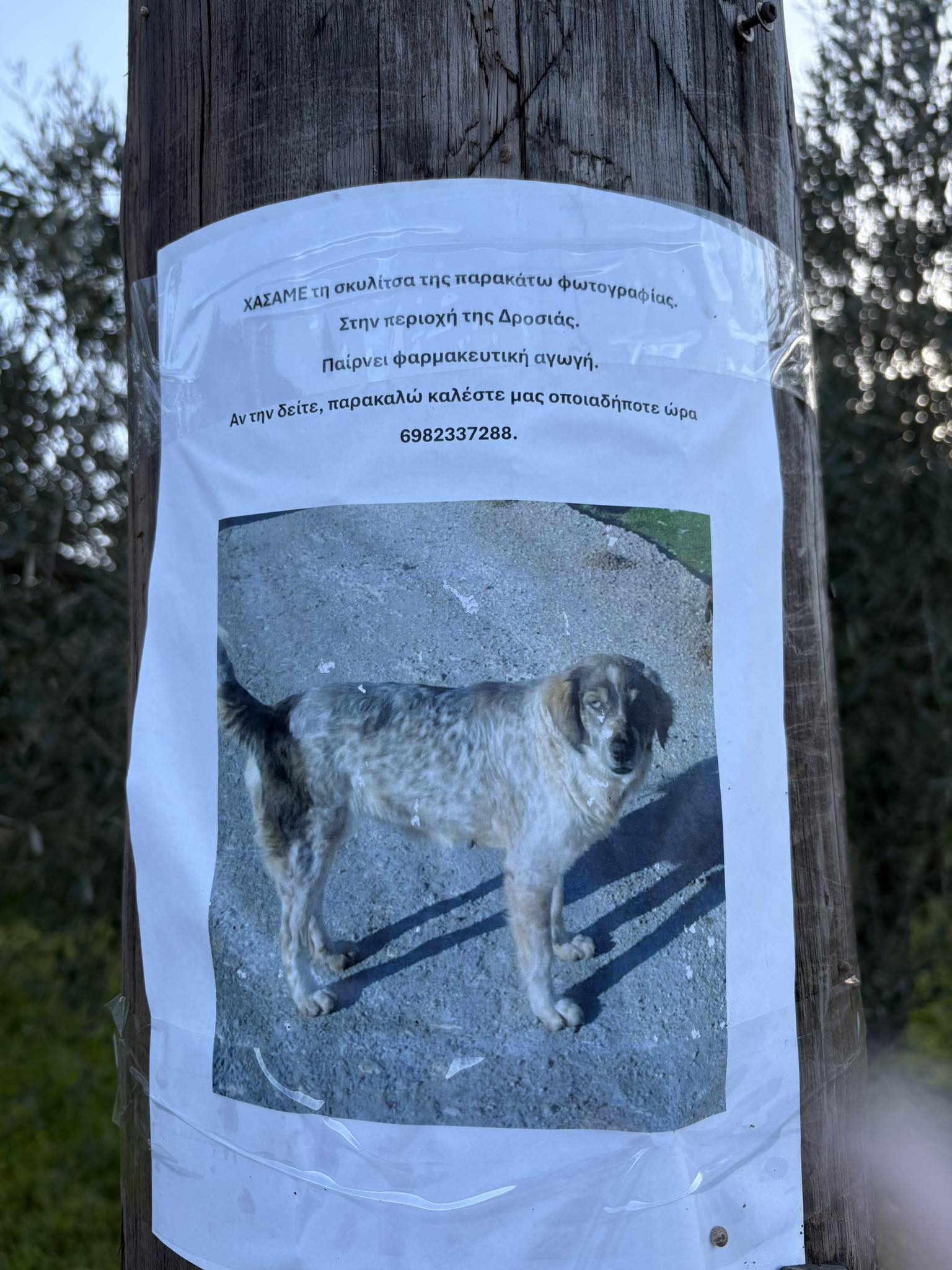 Ανησυχία προκαλεί η εξαφάνιση σκυλίτσας στην περιοχή της Δροσιάς Χαλκίδας. Σύμφωνα με πληροφορίες, το ζώο έχει χαθεί και χρειάζεται φαρμακευτική αγωγή, γεγονός που καθιστά επιτακτική την άμεση εύρεσή του.