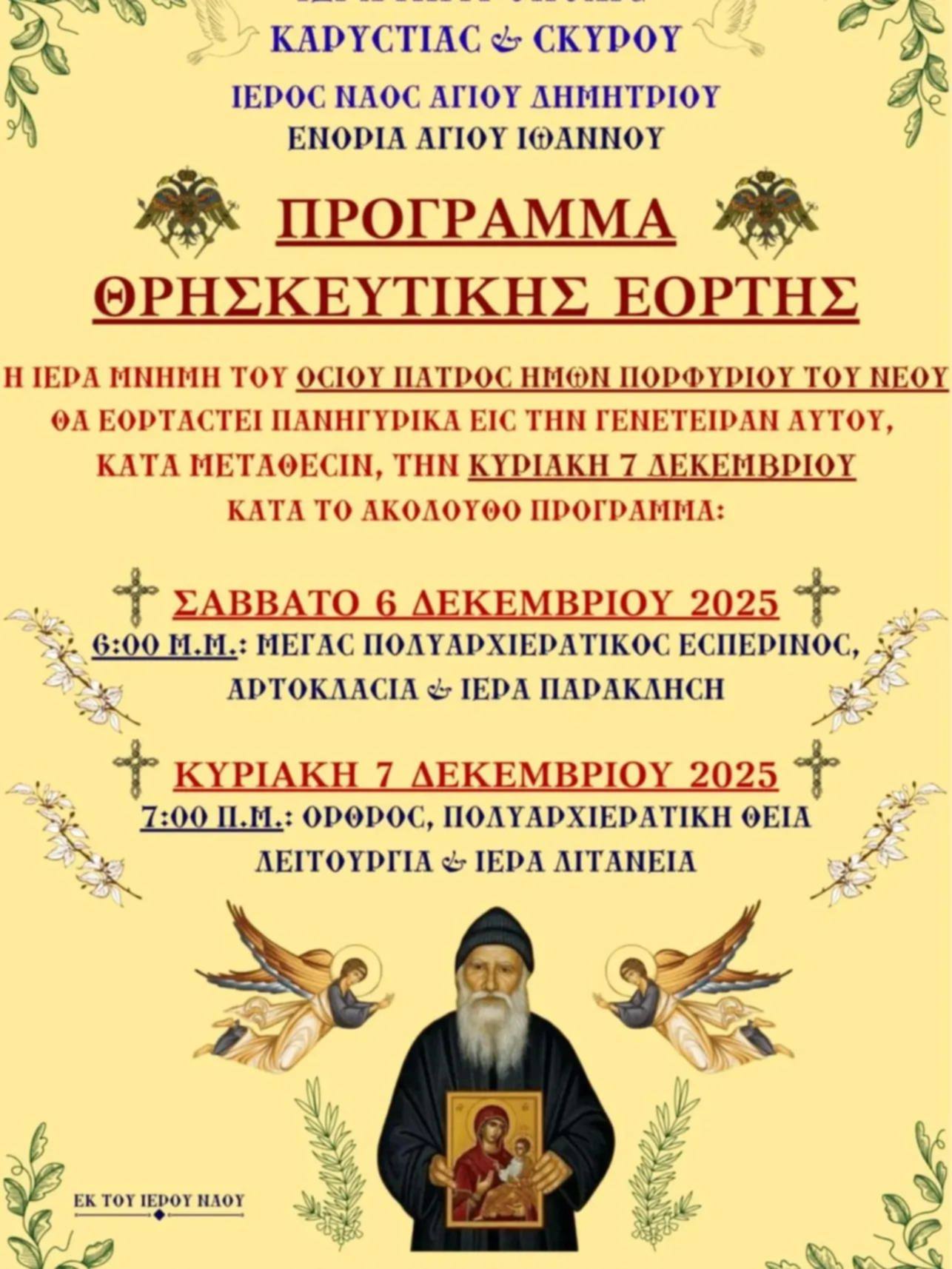 Λαμπρός Πανηγυρικός Εορτασμός προς Τιμήν του Οσίου Πορφυρίου του Νέου στον Άγιο Ιωάννη ΑλιβερίουΜε ιδιαίτερη κατάνυξη και βαθύ θρησκευτικό συναίσθημα αναμένεται να τιμηθεί φέτος η μνήμη του Οσίου Πορφυρίου του Νέου στον τόπο καταγωγής του, το χωριό Άγιος Ιωάννης Αλιβερίου, όπου κάθε χρόνο συγκεντρώνονται εκατοντάδες πιστοί από την ευρύτερη περιοχή της Καρύστιας και της Σκύρου.