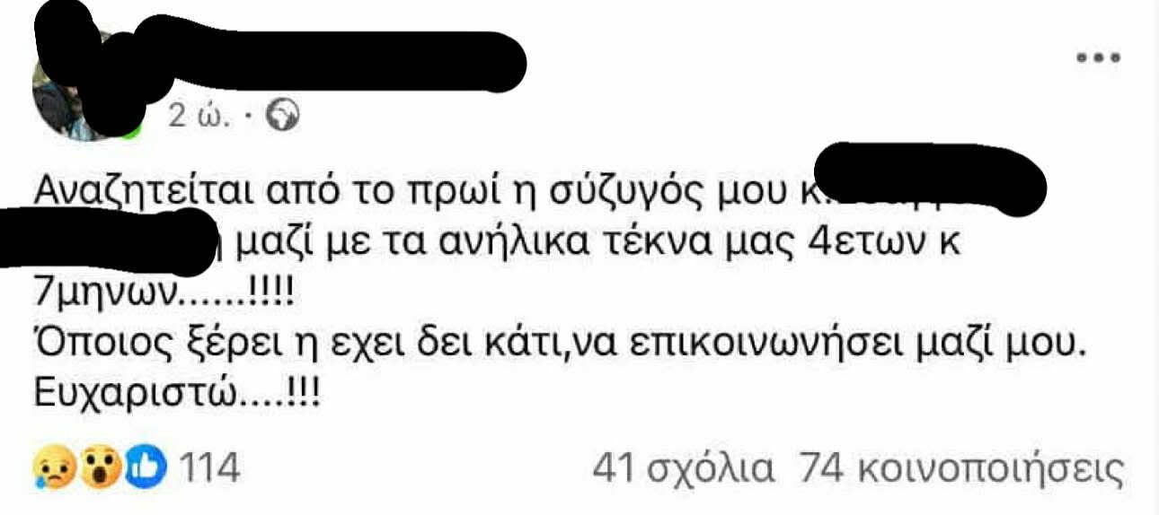 Η ανησυχία είναι μεγάλη τόσο για τη μητέρα όσο και για τα δύο μικρά παιδιά, με τις αρχές να έχουν ενημερωθεί και να συμμετέχουν στις έρευνες.