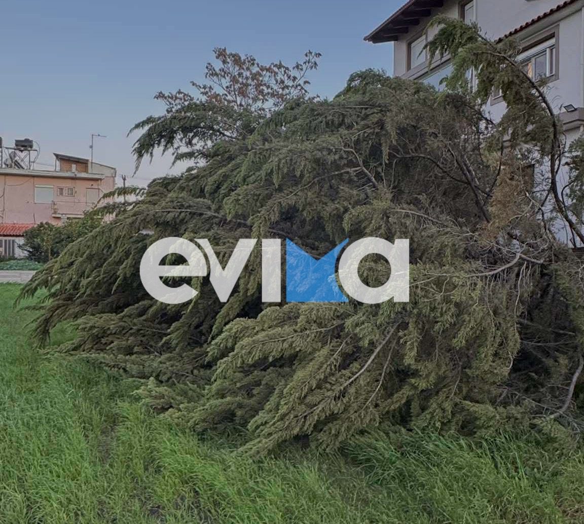 Σοβαρές ζημιές προκάλεσε η κακοκαιρία που έπληξε την περιοχή των Ψαχνών Ευβοίας, όταν κυπαρίσσι ηλικίας περίπου 25 ετών ξεριζώθηκε σε αυλή κατοικίας.