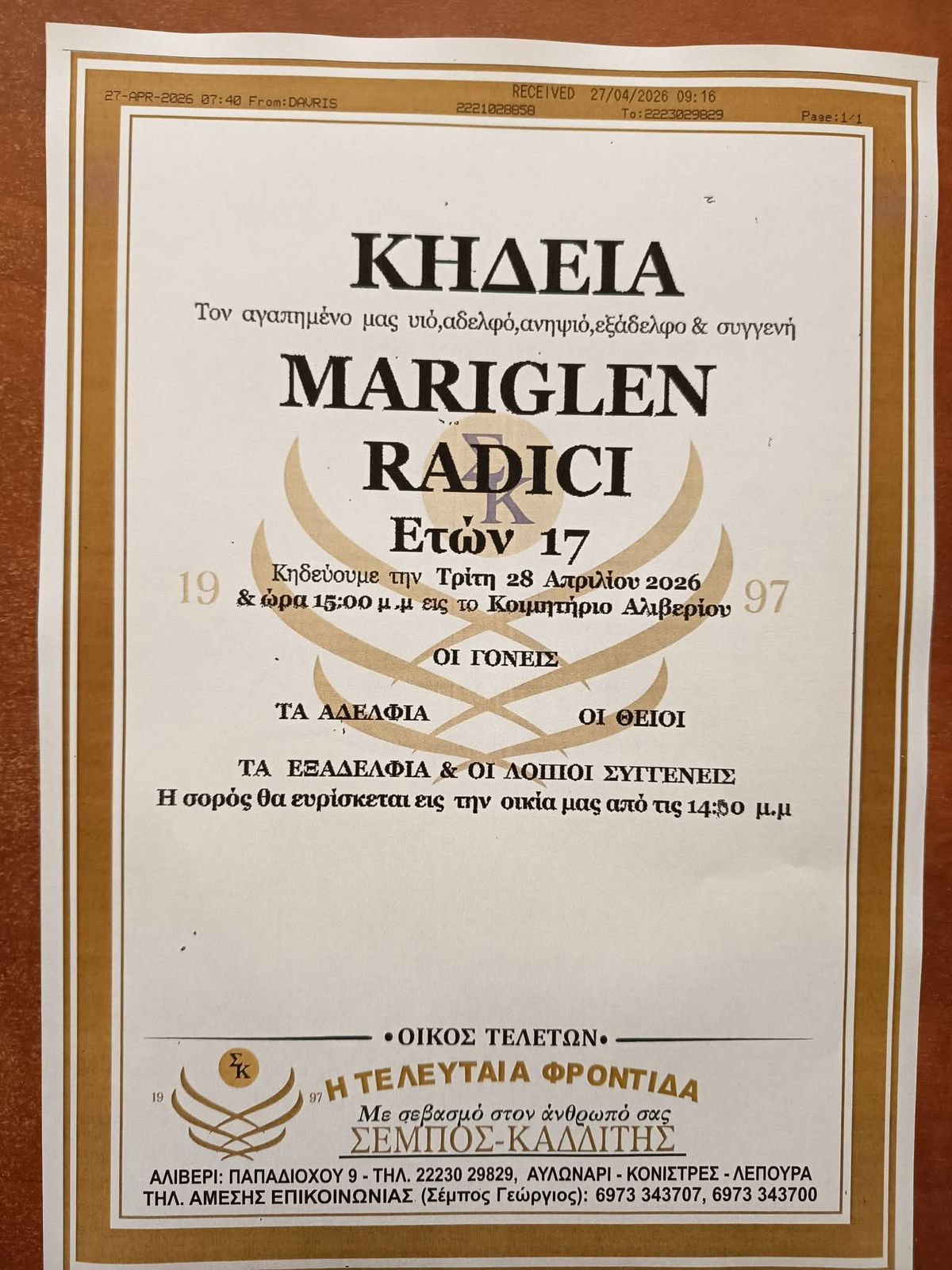 Σύμφωνα με τις τελευταίες πληροφορίες, η κηδεία του 17χρονου θα τελεστεί αύριο, στο κοιμητήριο Αλιβερίου, όπου συγγενείς, φίλοι και πλήθος κόσμου θα του απευθύνουν το τελευταίο αντίο.