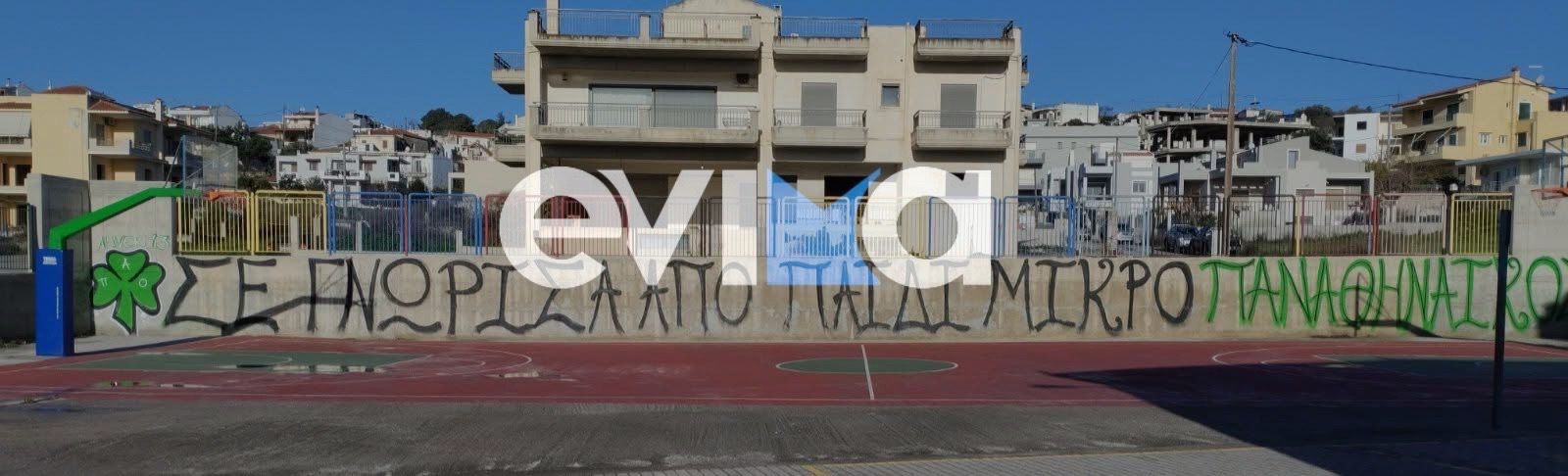 Τραυματισμός της σχολικής αθωότητας το βράδυ της Παρασκευής στο Αλιβέρι: άγνωστοι βανδάλισαν τον προαύλιο χώρο του Δεύτερου Δημοτικού Σχολείου, γράφοντας συνθήματα που προάγουν την οπαδική βία σε τοίχους όπου παίζουν και μορφώνονται τα μικρά παιδιά της πόλης.