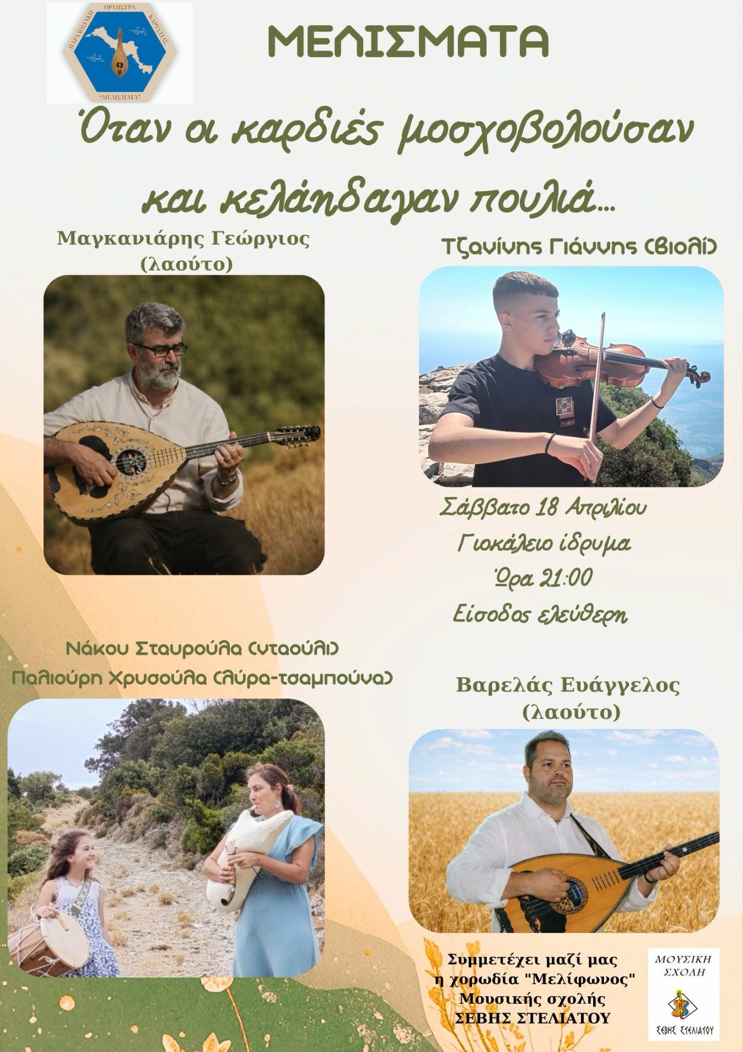 Με τη συμμετοχή αξιόλογων μουσικών και της χορωδίας «Μελίφωνος» της Μουσικής Σχολής Σέβης Στελιάτου, το κοινό θα έχει την ευκαιρία να απολαύσει μια βραδιά γεμάτη ευαισθησία, ποιότητα και αυθεντική ελληνική μουσική έκφραση. Μια εκδήλωση που τιμά την παράδοση, αναδεικνύει τη δύναμη της μουσικής και προσφέρει στο κοινό μια εμπειρία γεμάτη εικόνες, αναμνήσεις και συγκίνηση.