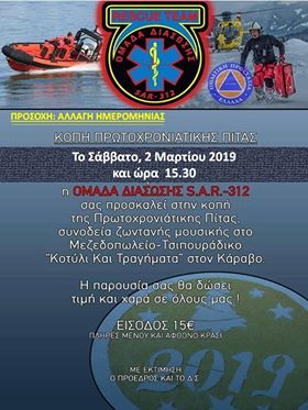 Λόγω των επικίνδυνων καιρικών φαινομένων και δυσμενών συνθηκών του φαινομένου “Ωκεανίς” σύμφωνα με τα έκτακτα καιρικά δελτία της Εθνικής Μετεωρολογικής Υπηρεσίας από το Σάββατο 23 Φεβρουαρίου 2019 με χιονοπτώσεις, ισχυρές βροχές, καταιγίδες και θυελλώδεις ανέμους, η Ομάδα Διάσωσης Εύβοιας Sar 312 αναβάλλει την κοπή της πρωτοχρονιάτικης πίτας της για το ερχόμενο Σάββατο 2 Μαρτίου 2019 στις 15.30 καθώς η ίδια και όσες οργανώσεις συμμετέχουν στην Γενική Γραμματεία Πολιτικής Προστασίας θα βρίσκονται σε επιφυλακή για την προστασία και ασφάλεια των πολιτών.