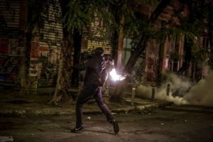 Τα Εξάρχεια μετατράπηκαν σε πεδίο μάχης, το βράδυ του Σαββάτου, καθώς ομάδες κουκουλοφόρων εκσφενδόνιζαν βόμβες μολότοφ, πέτρες, ακόμη και φωτοβολίδες ευθείας βολής προς τους αστυνομικούς, ενώ τα ΜΑΤ απαντούσαν με χρήση χημικών και χειροβομβίδες κρότου λάμψης.