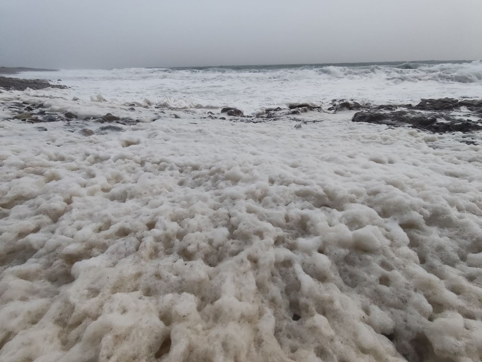 Τα μανιασμένα κύματα από τους θυελλώδεις ανέμους που έπνεαν στην περιοχή γέμισαν την ακτή με αφρό.