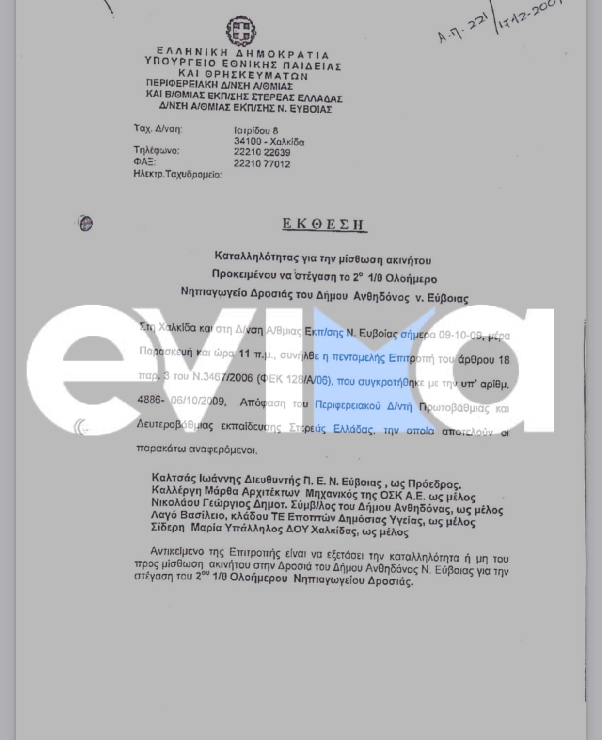 Αξιότιμη κ. Δήμαρχε του Δήμου Χαλκιδέων, με αφορμή την έντονη σεισμική δραστηριότητα των τελευταίων ημερών (της οποίας το επίκεντρο είναι στην περιοχή μας),σας υπενθυμίζουμε ότι το σχολείο μας(2° Νηπιαγωγείο Δροσιάς) στεγάζεται σε ακατάλληλο κτίριο(χωρίς οικοδομική άδεια και στατική μελέτη) σύμφωνα με την έκθεση της αρμόδιας επιτροπής με ημερομηνία 17/12/2009,την οποία σας επισυνάπτουμε.