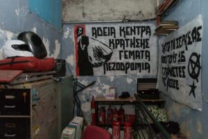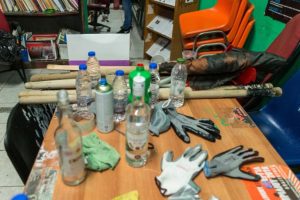 Κατά τη διάρκεια της έρευνας βρέθηκαν και κατασχέθηκαν, μεταξύ άλλων: κοντάρια, κράνη, γάντια, κουκούλες full face και ρούχα-υλικά αμφίεσης για κάλυψη χαρακτηριστικών καθώς και πυροσβεστήρες, διαρρηκτικά εργαλεία, φυλλάδια αναρχικού περιεχομένου και κομμάτια από μάρμαρα και πέτρες που χρησιμοποιούνται σε επιθέσεις.