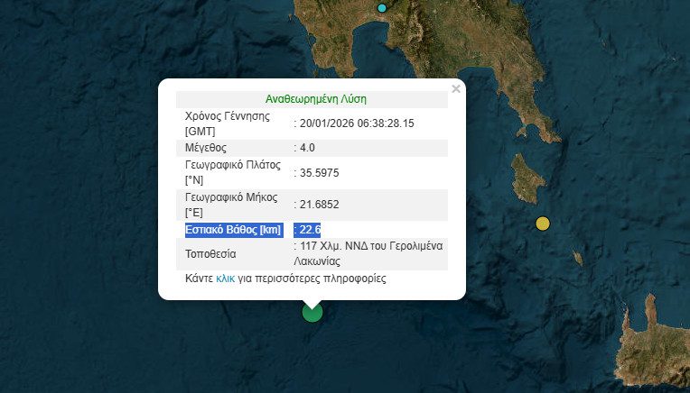 Το επίκεντρο της δόνησης εντοπίζεται στον θαλάσσιο χώρο 117 χλμ. νότια-νοτιοδυτικά του Γερολιμένα Λακωνίας