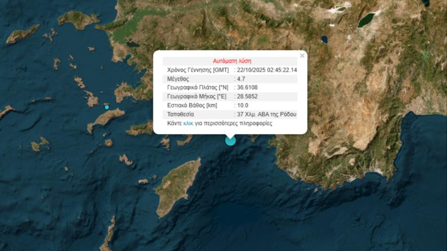 Το επίκεντρο της δόνησης εντοπίστηκε 35 χιλιόμετρα ανατολικά βορειοανατολικά της πρωτεύουσας του νομού ΔωδεκανήσωνΔυνατός σεισμός μεγέθους 4, 5 βαθμών της κλίμακας Ρίχτερ σημειώθηκε στις 05:45 τα ξημερώματα της Τετάρτης στα ανοιχτά της Ρόδου.