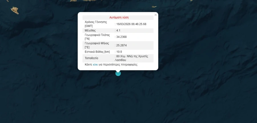 Σύμφωνα με το Γεωδυναμικό Ινστιτούτο ο σεισμός είχε επίκεντρο 80 χιλιόμετρα Νότια – Νοτιοδυτικά της Χρυσής Λασιθίου.