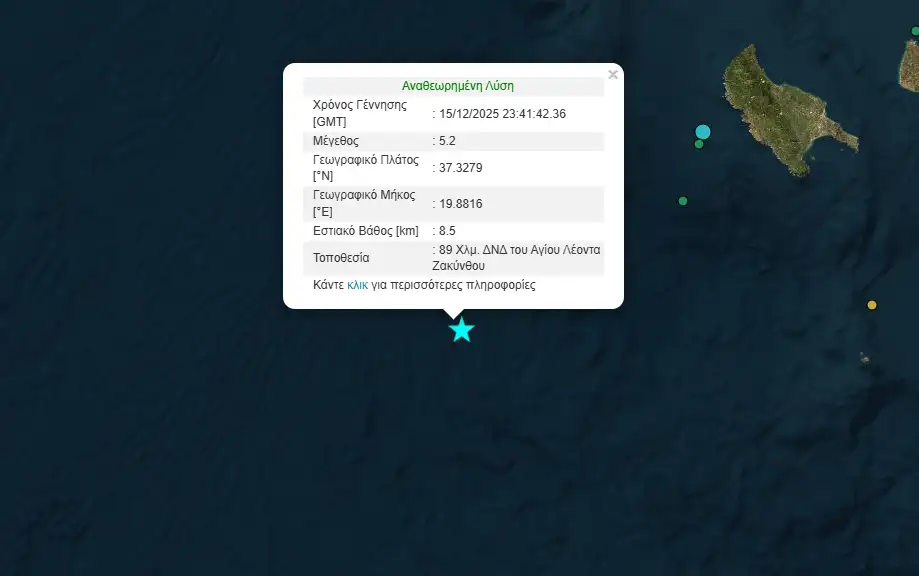 Το επίκεντρο ήταν στη θάλασσαΙσχυρή σεισμική δόνηση σημειώθηκε τις πρώτες πρωινές ώρες της Τρίτης 16 Δεκεμβρίου 2025 στον θαλάσσιο χώρο δυτικά της Ζακύνθου.