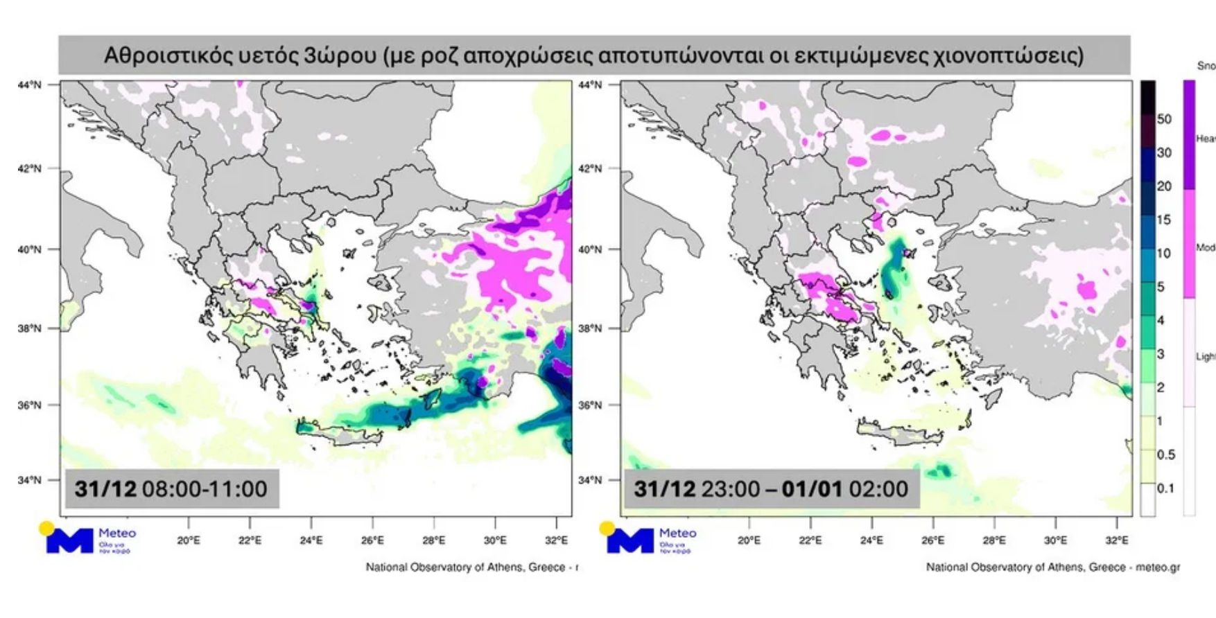 Την Τετάρτη 31/12 αναμένονται τοπικές βροχές στα πεδινά τμήματα της ανατολικής και νότιας χώρας, ενώ τοπικές χιονοπτώσεις αναμένονται αρχικά κυρίως στα ορεινά και ημιορεινά τμήματα της ανατολικής ηπειρωτικής χώρας (Θεσσαλία, Αν. Στερεά) και πρόσκαιρα και τοπικά έως και σε περιοχές με χαμηλό υψόμετρο. Τις βραδινές ώρες της Τετάρτης 31/12 και τις πρώτες πρωινές της Πέμπτης 1/1 (περίοδος χαμηλής προγνωσιμότητας) είναι πιθανό να σημειωθούν πρόσκαιρα τοπικές χιονοπτώσεις ακόμη και σε περιοχές με χαμηλό υψόμετρο (κατά τόπους έως και σε πεδινά τμήματα) της Μακεδονίας, της Θεσσαλίας, του Βορείου Αιγαίου και της Ανατολικής Στερεάς (συμπεριλαμβανομένης της Αττικής).